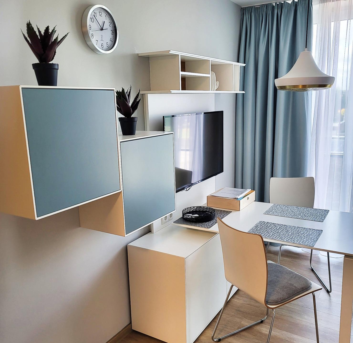Der Tisch im Essbereich mit 2 Stühlen ist multifunktional und kann durch seine technische Ausstattung auch als Schreibtisch genutzt werden. Ganz selbstverständlich verfügt das Apartment über einen kostenfreien Internetanschluss, einen internetfähigen Smart-TV und ein Bluetooth-Radio.