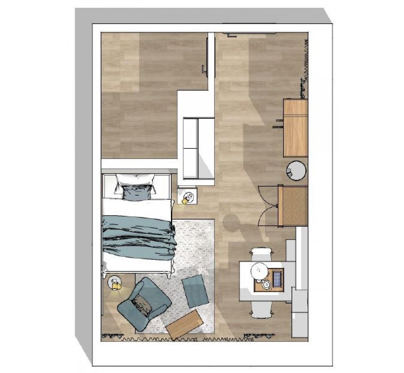 27qm: Wohn- & Schlafzimmer mit Boxspringbett, Bad mit bodengleicher Dusche