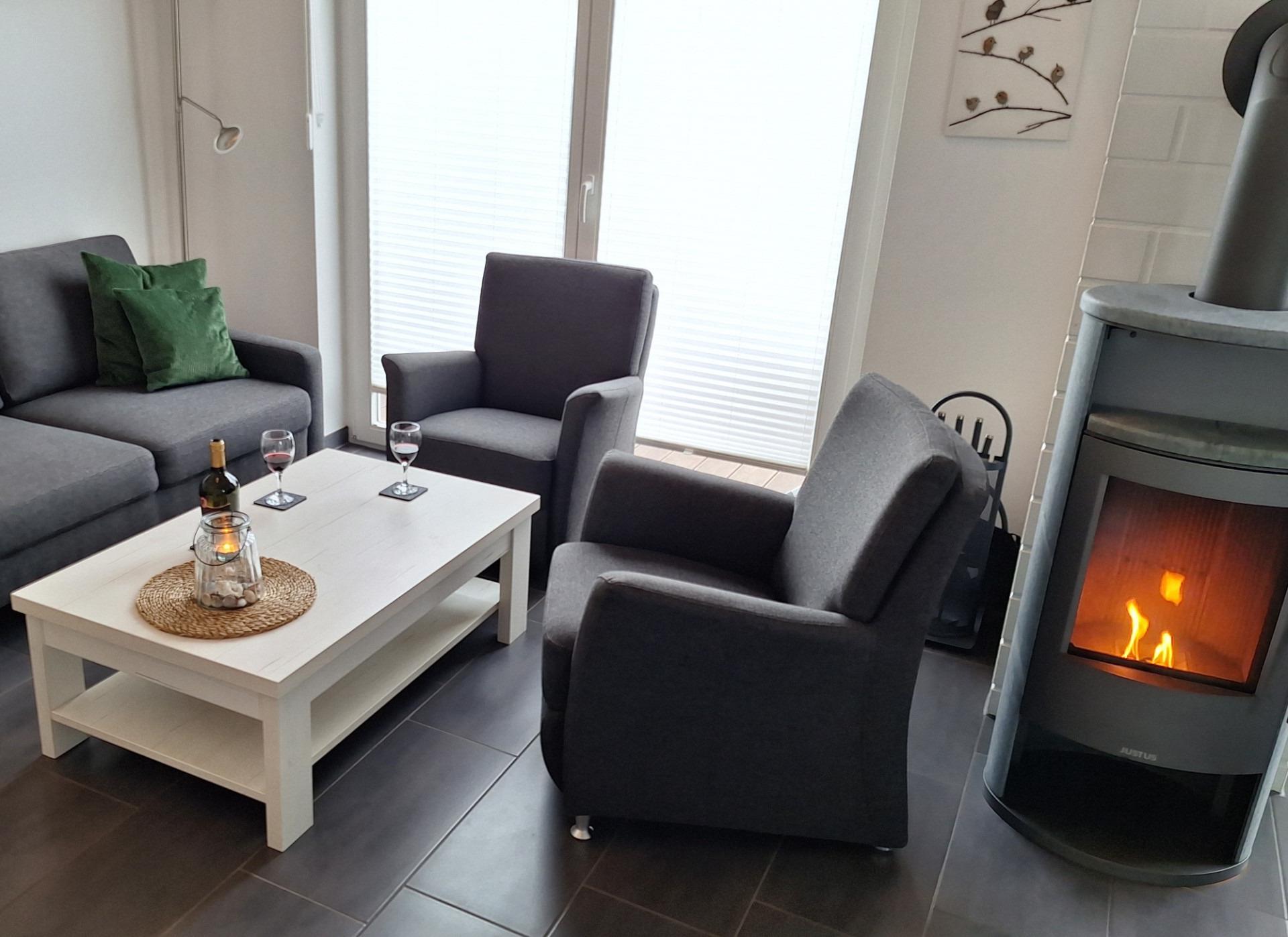 Im Erdgeschoß des Ferienhauses Nordwind erstreckt sich ein großzügiger Wohn- und Essraum mit modern ausgestatteter, offener Küche. Ein Kaminofen verwöhnt Sie, wenn es draußen schon dunkel und etwas kühler wird. Lassen Sie die Seele in der Sauna baumeln und entspannen Sie im Whirlpool.