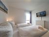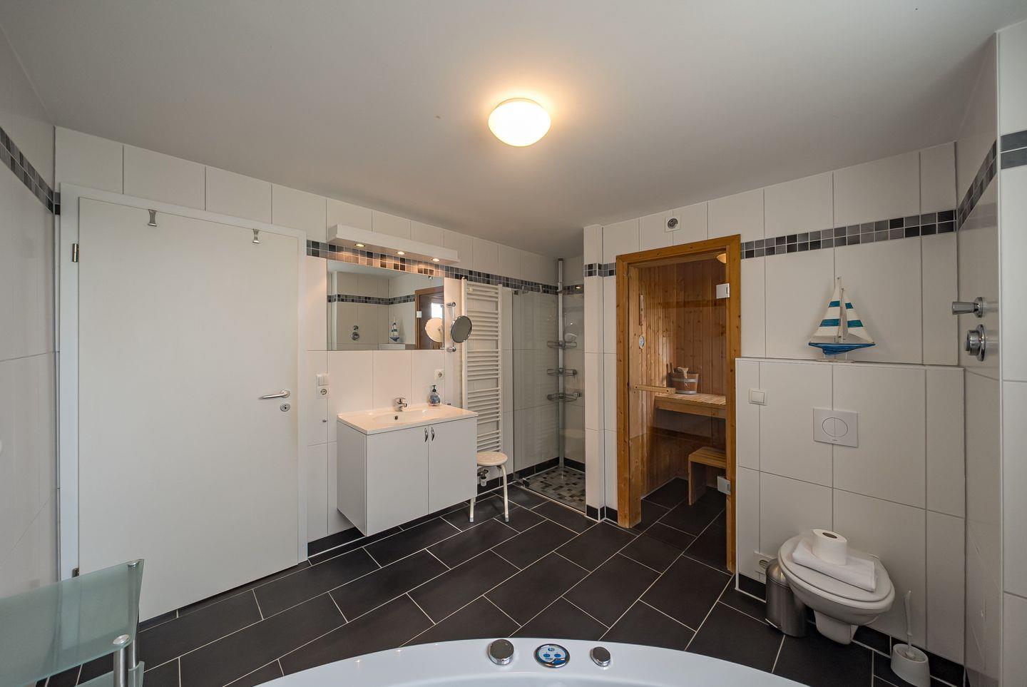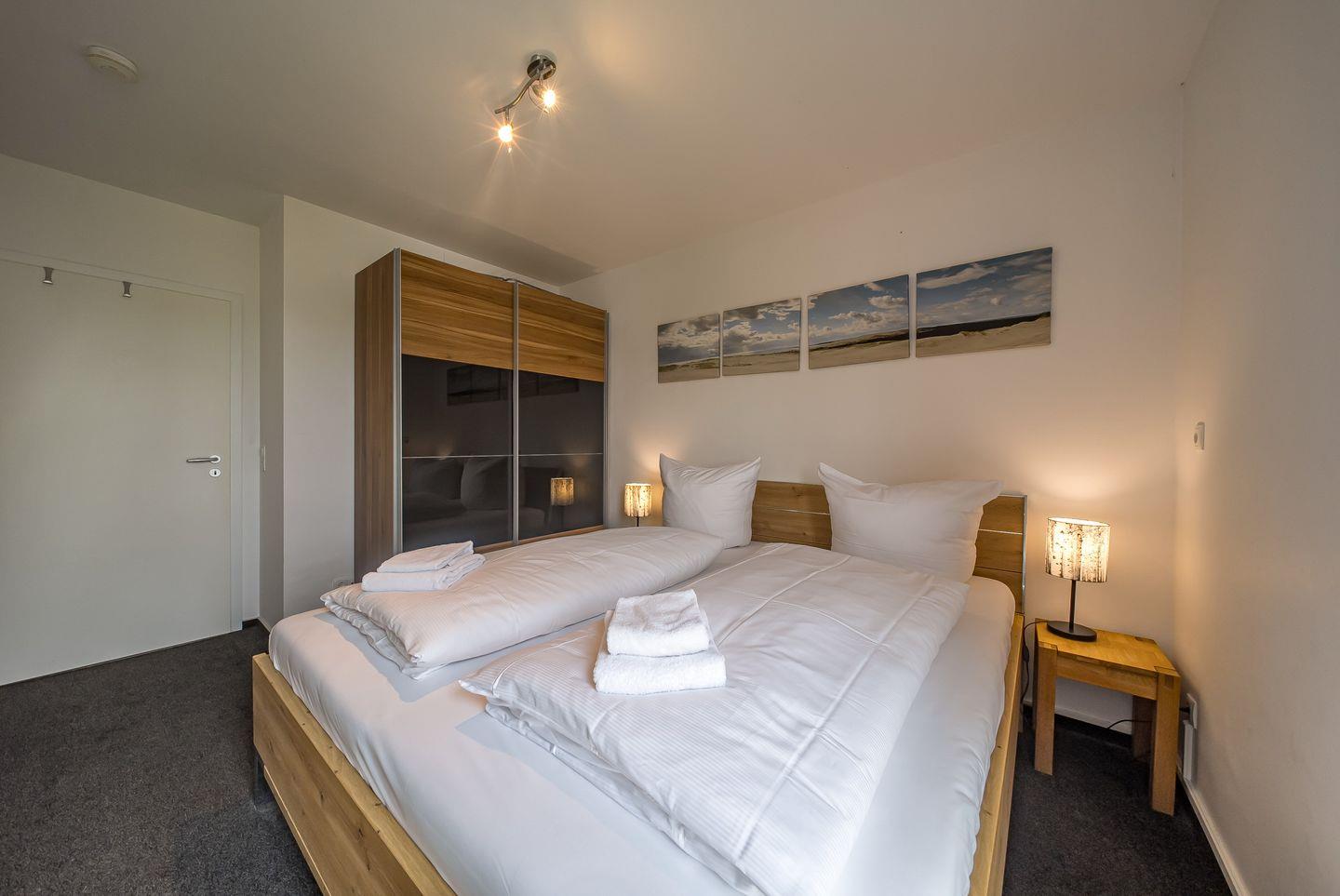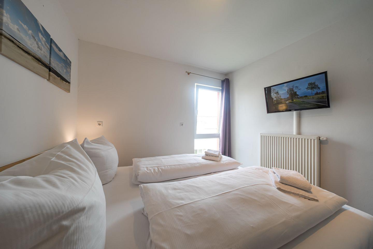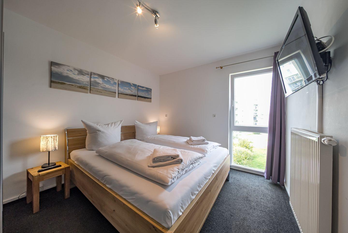 2 Schlafzimmer mit Doppelbett bzw. 2 Einzelbetten, Wohnbereich, geräumiges Bad mit Dusche, Whirlbadewanne, Sauna und Fußbodenheizung und Balkon mit Blick auf die Nordsee-Idylle ergeben die Konzeption des Apartments.