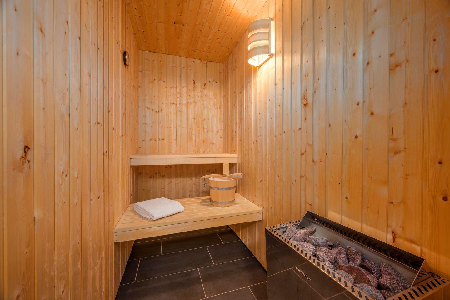 Im ersten Obergeschoss liegen zwei Schlafzimmer sowie das große Badezimmer mit ebenerdiger Regendusche, Badewanne, Toilette und Sauna. Gerade an stürmischen, regnerischen oder winterlichen Tagen verleihen Bad, Sauna, Kamin und die Loggia im Dachgeschoss dem Haus einen besonderen Wellness-Charakter. Ein Schlafzimmer ist mit einem Doppelbett und Fernseher ausgestattet, das zweite mit zwei Einzelbetten.