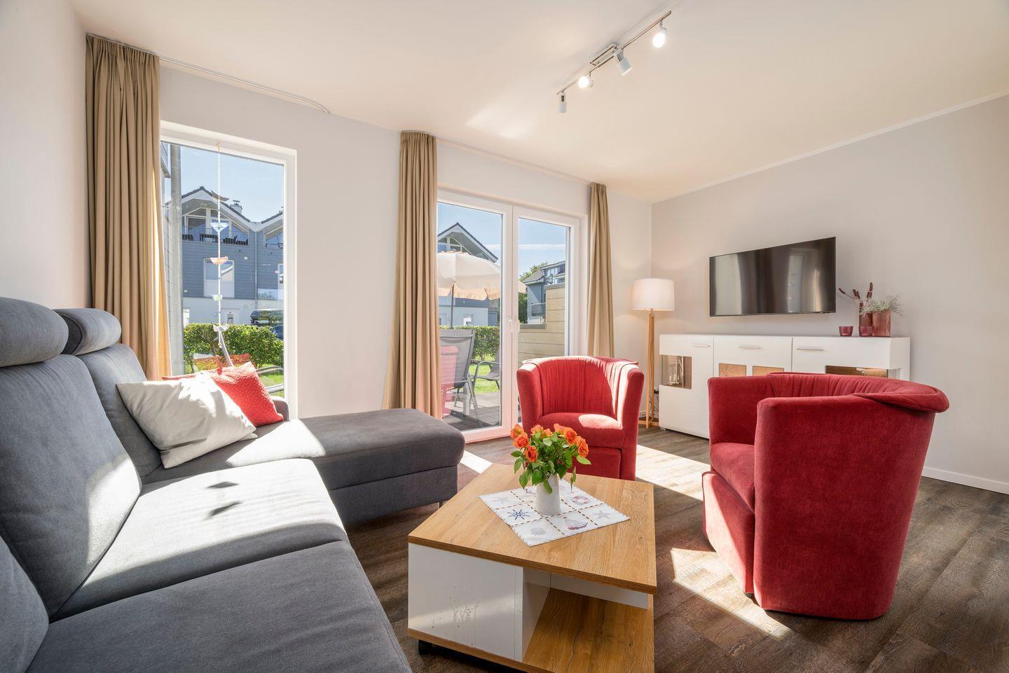 Im Erdgeschoss erreicht man über einen kleinen Windfang den hellen Wohnbereich. Die moderne Küche ist bestens ausgestattet mit Spülmaschine, Kühlschrank mit Tiefkühlfach, Ceranherd mit vier Kochfeldern, Backofen, Mikrowelle, Kaffeemaschine, Espressokocher, Milchaufschäumer, Wasserkocher, Eierkocher und Toaster. Geschirr, Gläser, Besteck, Töpfe, Pfannen sowie ein Raclette-Gerät sind ebenfalls vorhanden. Mittelpunkt dieser Etage ist der große Esstisch mit sechs Stühlen, der sowohl für gemeinsame Mahlzeiten als auch für gesellige Abende ideal geeignet ist. Der Kaminofen trägt zusätzlich zur gemütlichen Atmosphäre bei. Im hinteren Bereich, zur Terrasse gelegen, befindet sich eine Sofaecke mit Fernseher. Ein Gäste-WC komplettiert das Erdgeschoss. Die möblierte Südterrasse ist mit Tisch, sechs Sitzgelegenheiten und einem Sonnenschirm ausgestattet.