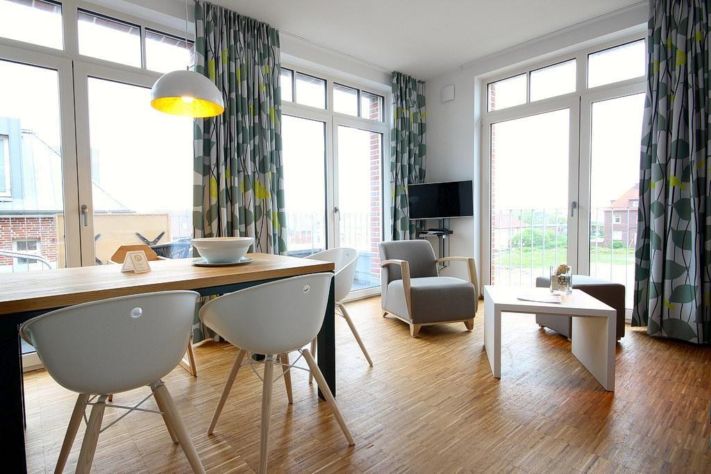Das barrierearme und helle Apartment mit Meerblick verfügt über kostenfreies WLAN und eine voll ausgestattete offene Küche mit Geschirrspüler, Gefrierfach, Kaffeemaschine, Toaster, Wasserkocher und Backofen. Beide Schlafzimmer sind jeweils mit einem Doppelbett ausgestattet; im Wohnbereich befindet sich eine Doppelschlafcouch sowie ein Flatscreen-TV. Ein Kinderbett kann gegen Entgelt aufgestellt werden. Im modernen und hellen Badezimmer befindet sich eine große begehbare Dusche sowie ein Waschtisch mit Föhn und Kosmetikspiegel. Auf dem sonnenreichen Südbalkon könnt ihr den ganzen Tag die Sonne bei wohltuendem Meeresklima genießen.