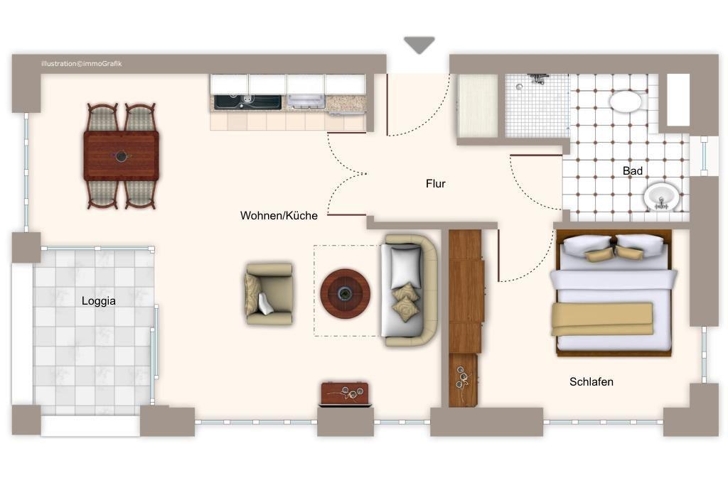 Die 48 m² große 2-Zimmer Ferienwohnung ist für bis zu 4 Personen geeignet. Besonders hervorzuheben ist die sonnige Loggia in Süd-Ost-Lage.