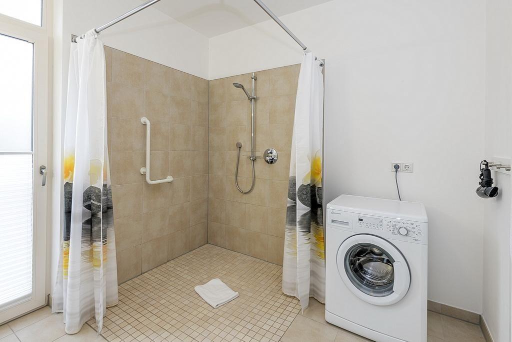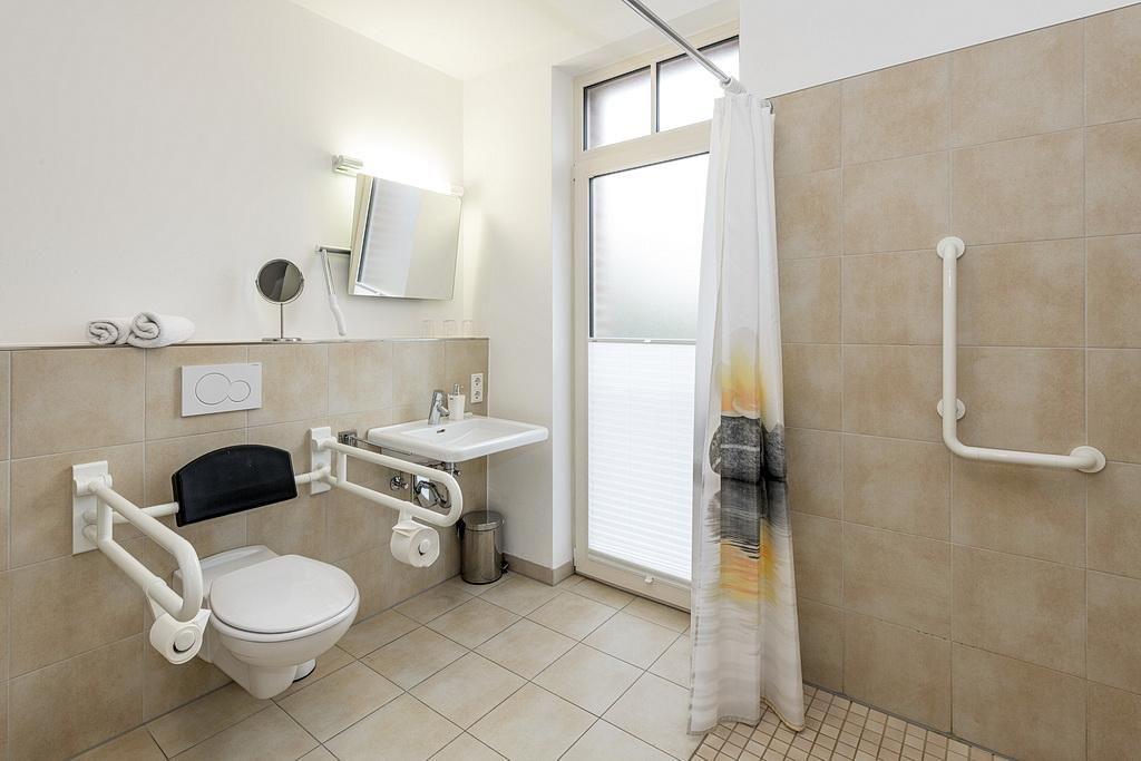 Das barrierearme Apartment verfügt über kostenfreies WLAN und eine voll ausgestattete offene Küche mit Gefrierfach, Kaffeemaschine, Toaster, Wasserkocher und Backofen. Das Schlafzimmer ist mit einem Doppelbett ausgestattet; im Wohnbereich befindet sich eine Doppelschlafcouch. Ein Kinderbett kann gegen Entgelt aufgestellt werden. Im modernen und hellen Badezimmer stehen euch eine große begehbare Dusche sowie ein Föhn und Kosmetikspiegel zur Verfügung. Das Bas verfügt zudem über ein höhenverstellbarer Spiegel sowie eine Toilette mit Haltegriffen und Rückenlehne. Das großzügige Apartment bietet euch eine eigene Waschmaschine. Auf der geschützten und sonnenreichen Loggia lässt es sich wunderbar entspannen.