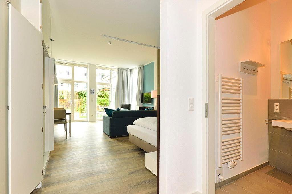 Das Apartment ist mit einer kleinen, aber feinen Pantryküche ausgestattet. Diese verfügt u. a. über ein Gefrierfach, eine Kaffeemaschine, einen Toaster und einen Wasserkocher. Im stilvollen Badezimmer befinden sich eine begehbare Dusche sowie ein Waschtisch mit Föhn und Kosmetikspiegel. Das moderne Wohn- und Schlafzimmer bietet euch einen großen Flatscreen-TV, eine HiFi-Anlage und eine Einzelschlafcouch. Ein Kinderbett kann gegen Entgelt im Wohnbereich aufgestellt werden. Auf der sonnigen Terrasse mit eigenem Strandkorb lässt sich den ganzen Tag entspannen.
