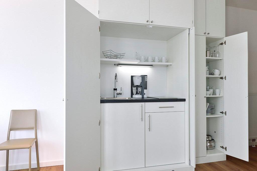 Das Apartment ist mit einer kleinen, aber feinen Pantryküche ausgestattet. Diese verfügt u. a. über ein Gefrierfach, eine Kaffeemaschine, einen Toaster und einen Wasserkocher. Im stilvollen Badezimmer befinden sich eine große, begehbare Dusche sowie ein Waschtisch mit Föhn und Kosmetikspiegel.