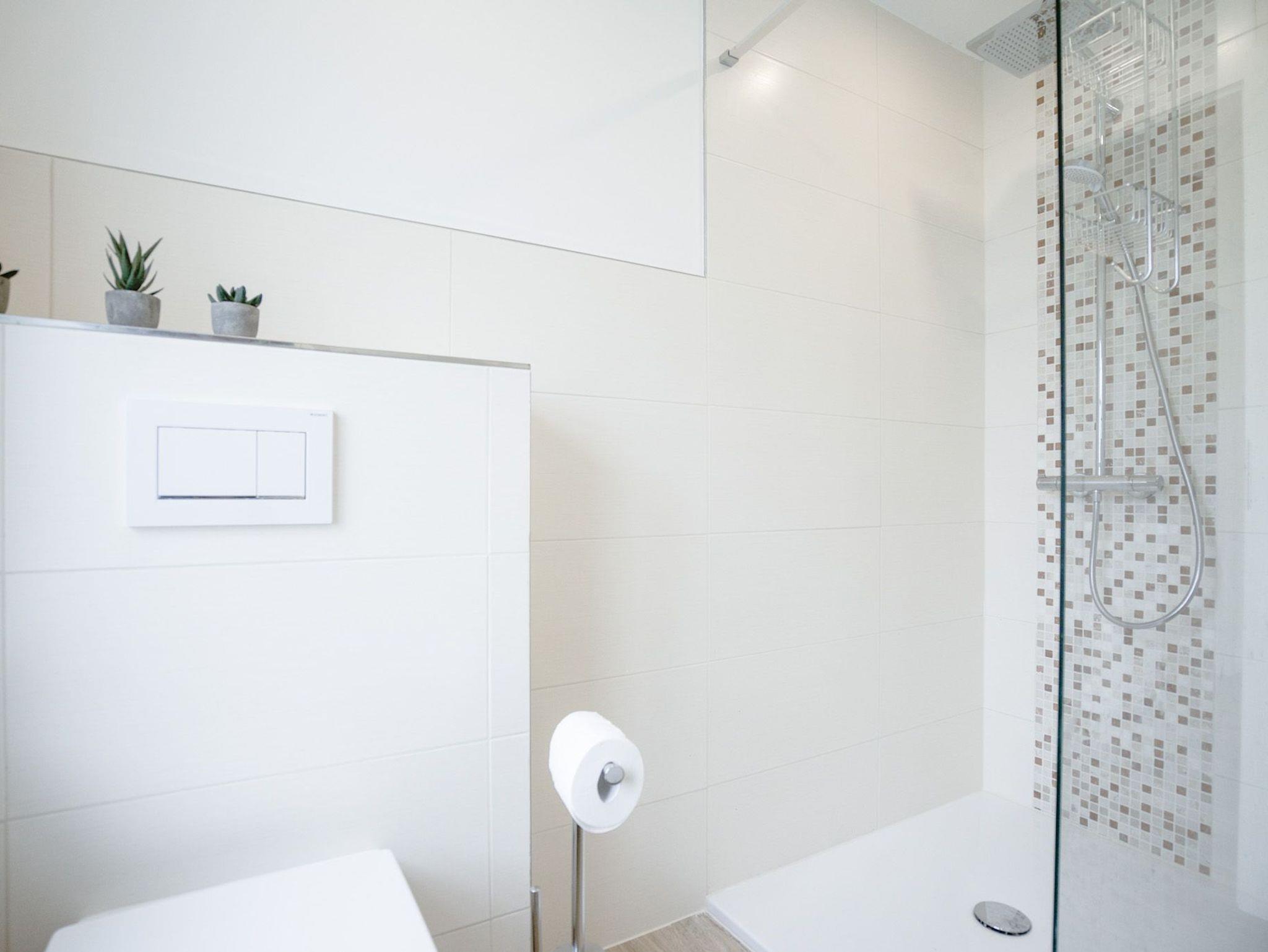 Das Bad bietet eine einladende ebenerdige Regendusche. In einem kleinen Hauswirtschaftsraum steht Ihnen eine Waschmaschine zur Verfügung. Die Wohnung wird über eine Fußbodenheizung und indirekte Infrarotelemente erwärmt.