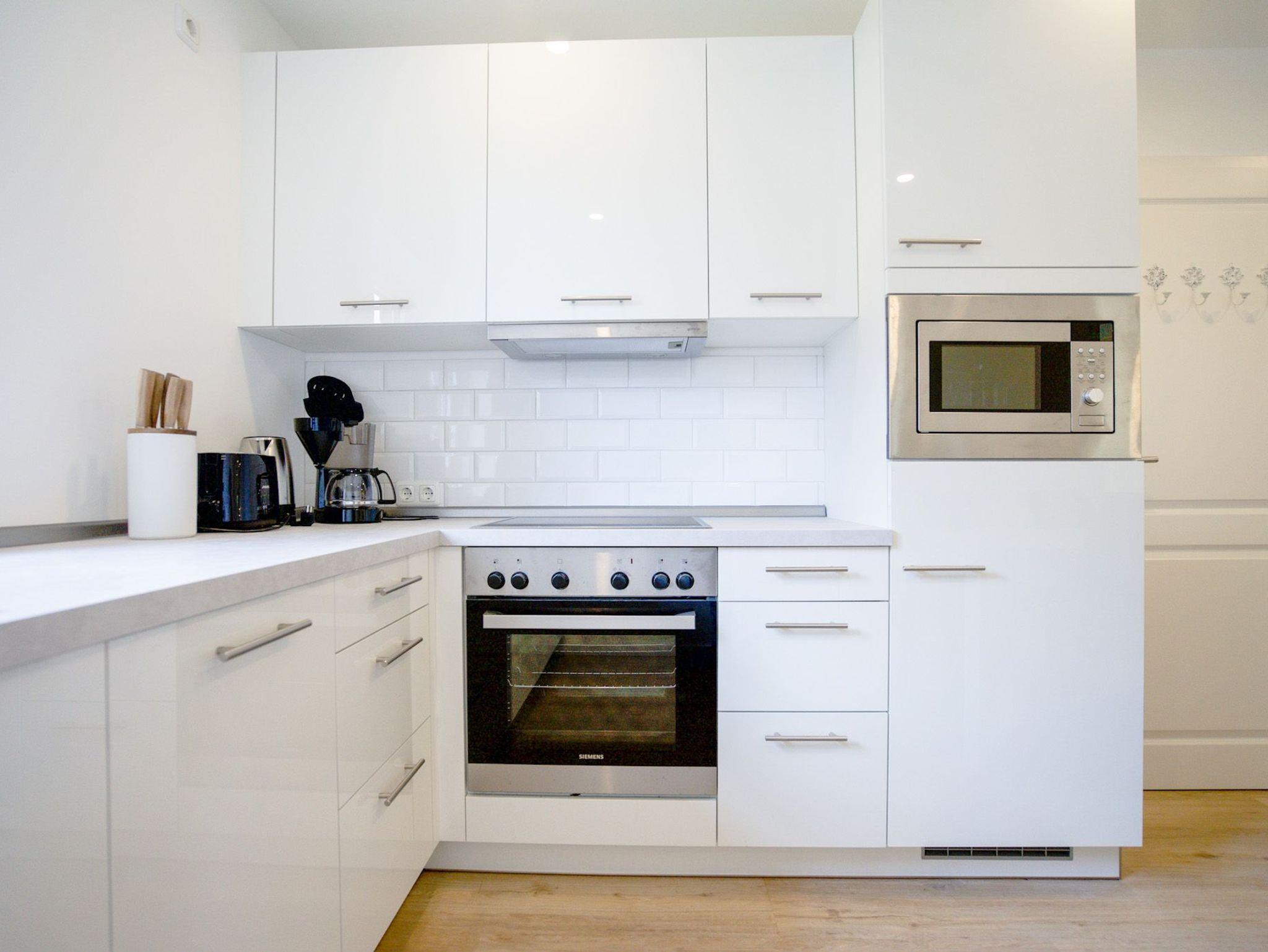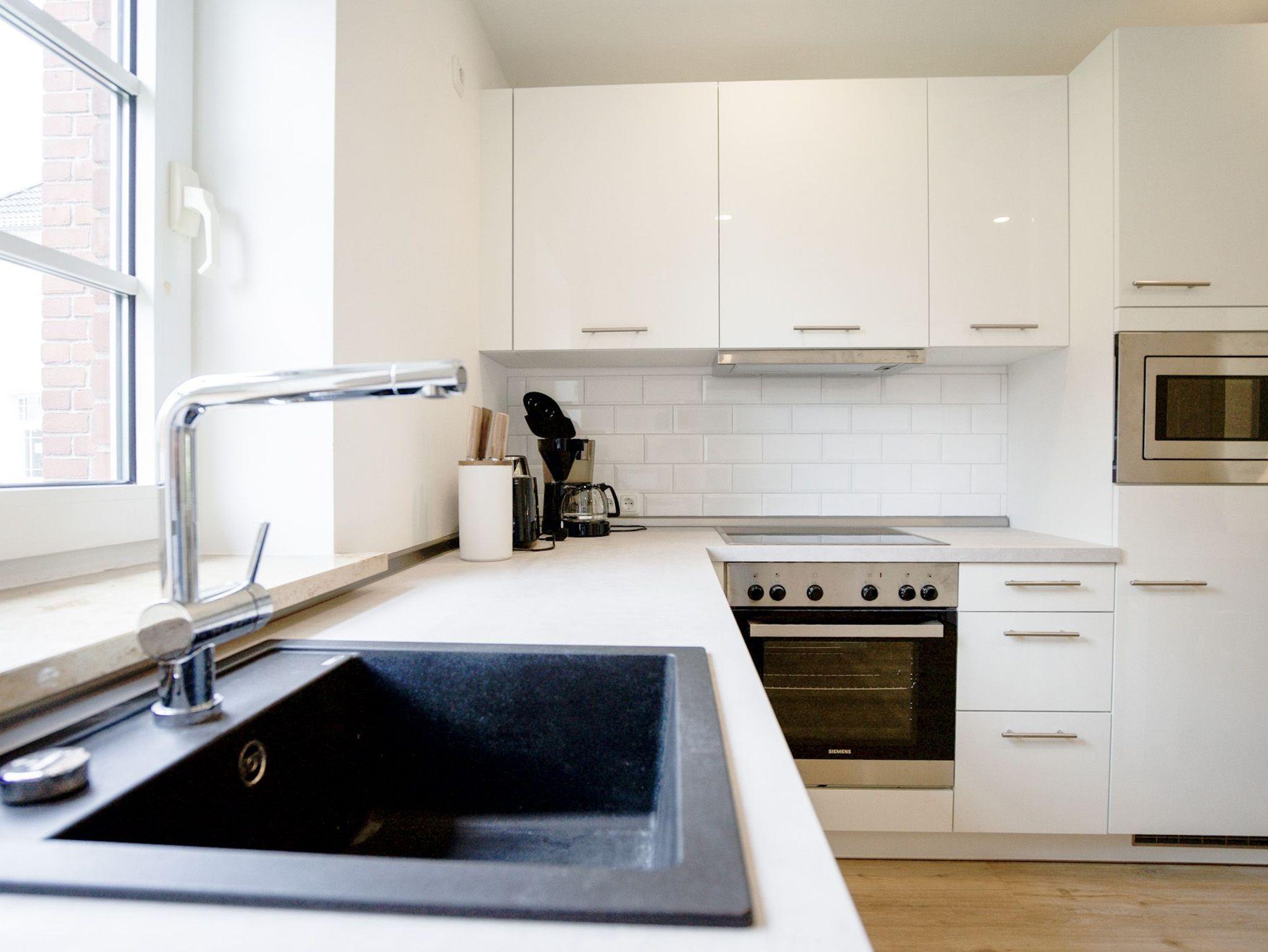 Die offene Küchenzeile ist hervorragend ausgestattet: Cerankochfeld, Backofen, Geschirrspülmaschine und Kaffeemaschine (Filtergröße 4).