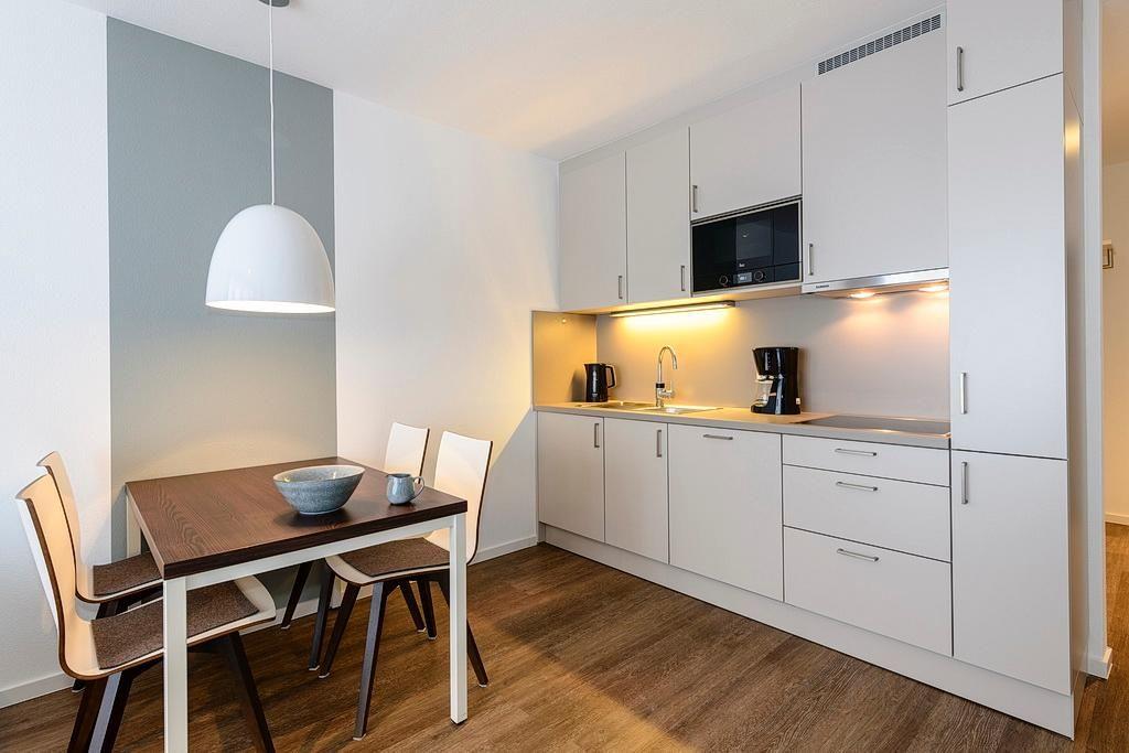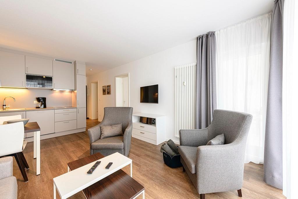 Das geschmackvoll eingerichtete Nichtraucher-Apartment verfügt über kostenfreies WLAN. Der Wohnbereich mit Schlafcouch bietet eine voll ausgestattete offene Küchenzeile mit Ceranherd mit Backofen, Geschirrspüler, Gefrierfach, Kaffeemaschine, Toaster, Wasserkocher und Mikrowelle mit Backfunktion sowie einen großen Flatscreen-TV und ein Radio. Das Apartment verfügt über einen Esstisch für 4 Personen und einen behaglichen Sitzbereich. Ein Schlafzimmer verfügt über ein Doppelbett und einen eigenen Flatscreen-TV, ein weiteres Schlafzimmer über zwei Einzelbetten. Ein Kinderbett kann gegen Entgelt aufgestellt werden. Im stilvollen Badezimmer befinden sich eine große begehbare Dusche sowie ein Waschtisch mit Föhn und Kosmetikspiegel. Nach einem erlebnisreichen Urlaubstag entspannt ihr auf dem überdachten und mit Gartenmöbeln für 4 Personen ausgestatteten Balkon. Dieser ist vom Wohnbereich und vom Hauptschlafzimmer aus zugänglich.