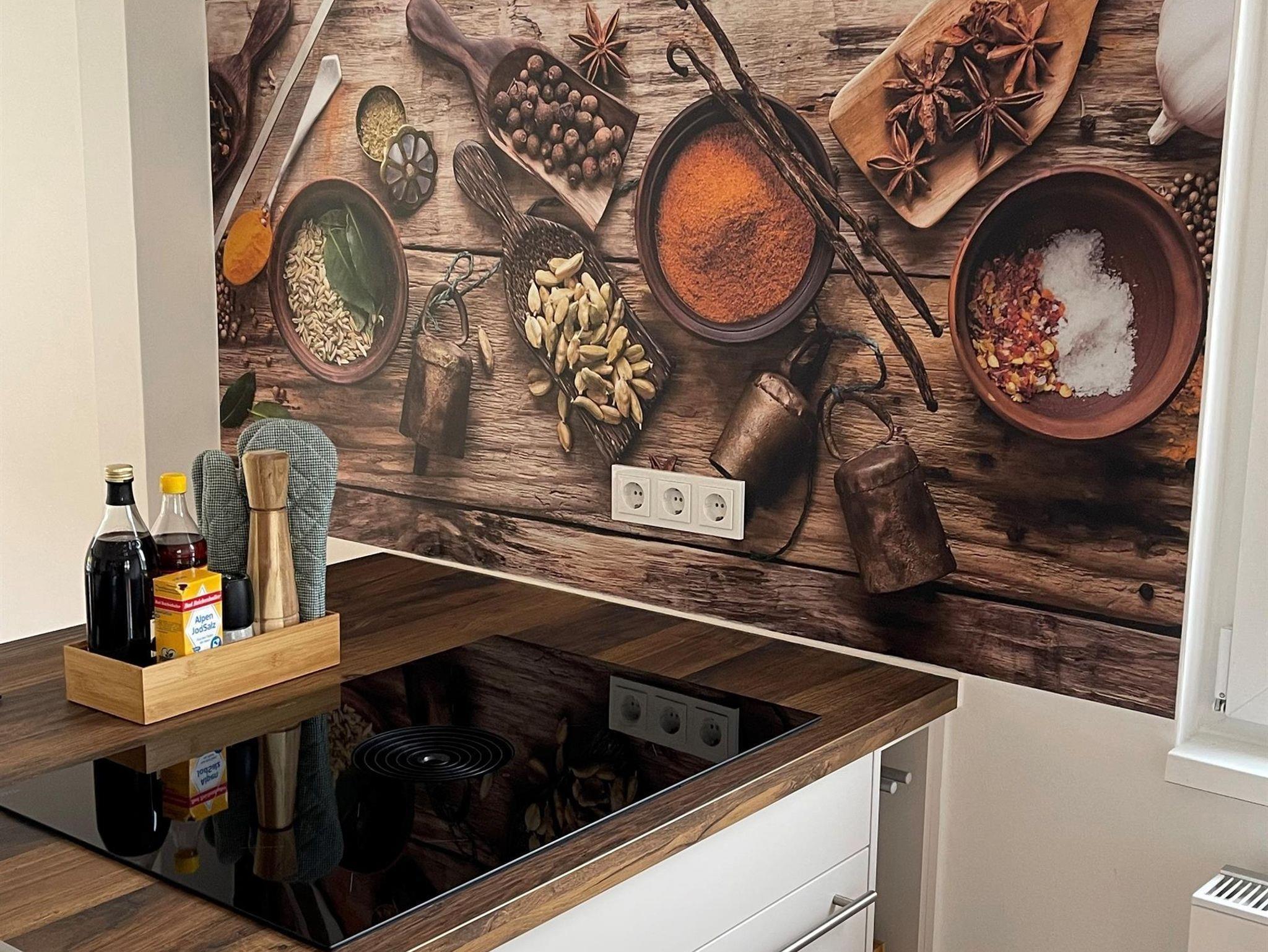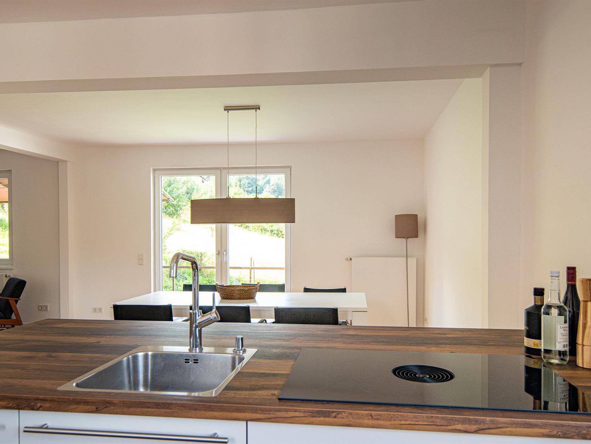 Unsere Gäste erwartet hinter der Eingangstür eine kleine Garderobe. Dort können nach einer Wanderung Schuhe und Jacken Platz finden. Auch für die vierbeinigen Familienmitglieder finden sich hier Haken für Leinen und Schmutzhandtücher. Eine schöne Holztreppe führt über 12 Stufen in unsere Wohnetage. In der modernen und voll ausgestatteten Küche findet sich alles, was man sich zum gemeinsamen Kochen wünscht: ausreichend Geschirr, Gläser und Besteck, eine praktische Kochinsel mit Induktionsherd und Spülmaschine, außerdem Backofen, Kühlschrank und Gefrierschrank. Weiterhin stehen auch eine Filterkaffeemaschine, ein Wasserkocher, ein Toaster, ein Handmixer und ein Raclettegerät bereit. Zusätzlich sind in der Küche eine Waschmaschine und ein Trockner vorhanden. Darüber hinaus stellen wir Geschirrhandtücher und eine Erstausstattung an Spülmittel, Spültabs, Schwammtücher, Waschmittel zur Verfügung.