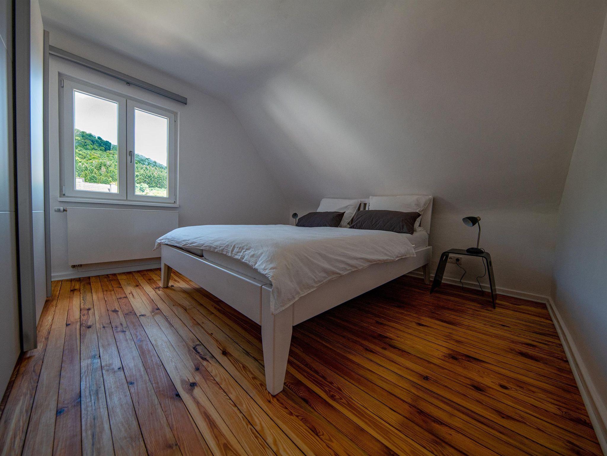 Die voll ausgestattete Küche enthält auch eine Spülmaschine und einen Induktionsherd mit Mittelabzug. Selbstverständlich stehen auch eine Waschmaschine und ein Trockner zur Verfügung. An die offene Küche schließt sich das Esszimmer an. Durch die Terrassentür betritt man einen großen Balkon, welcher einen tollen Blick auf die Wegelnburg gewährt. Gemütliche Sitzgelegenheiten laden auf einen Aperitif zum Sonnenuntergang ein. An kühleren Tagen sorgt ein Kaminofen im Wohnzimmer für wohlige Wärme.