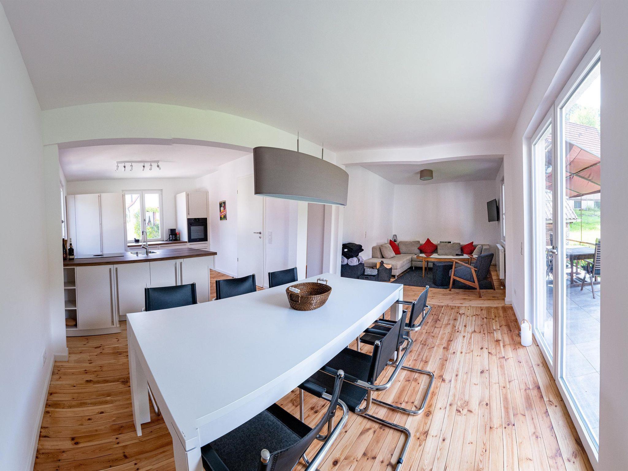 Im angrenzenden offenen Essbereich lädt ein großer Esstisch mit 6 bequemen Stühlen zum entspannten Zusammensitzen ein. Der Kaminofen (voraussichtlich ab November 2021) für kühlere Tage verbindet den Ess- mit dem Wohnbereich. Passende Anzünder und der erste Korb voll Brennholz stehen für einen gemütlichen Abend mit wohliger Wärme bereit.