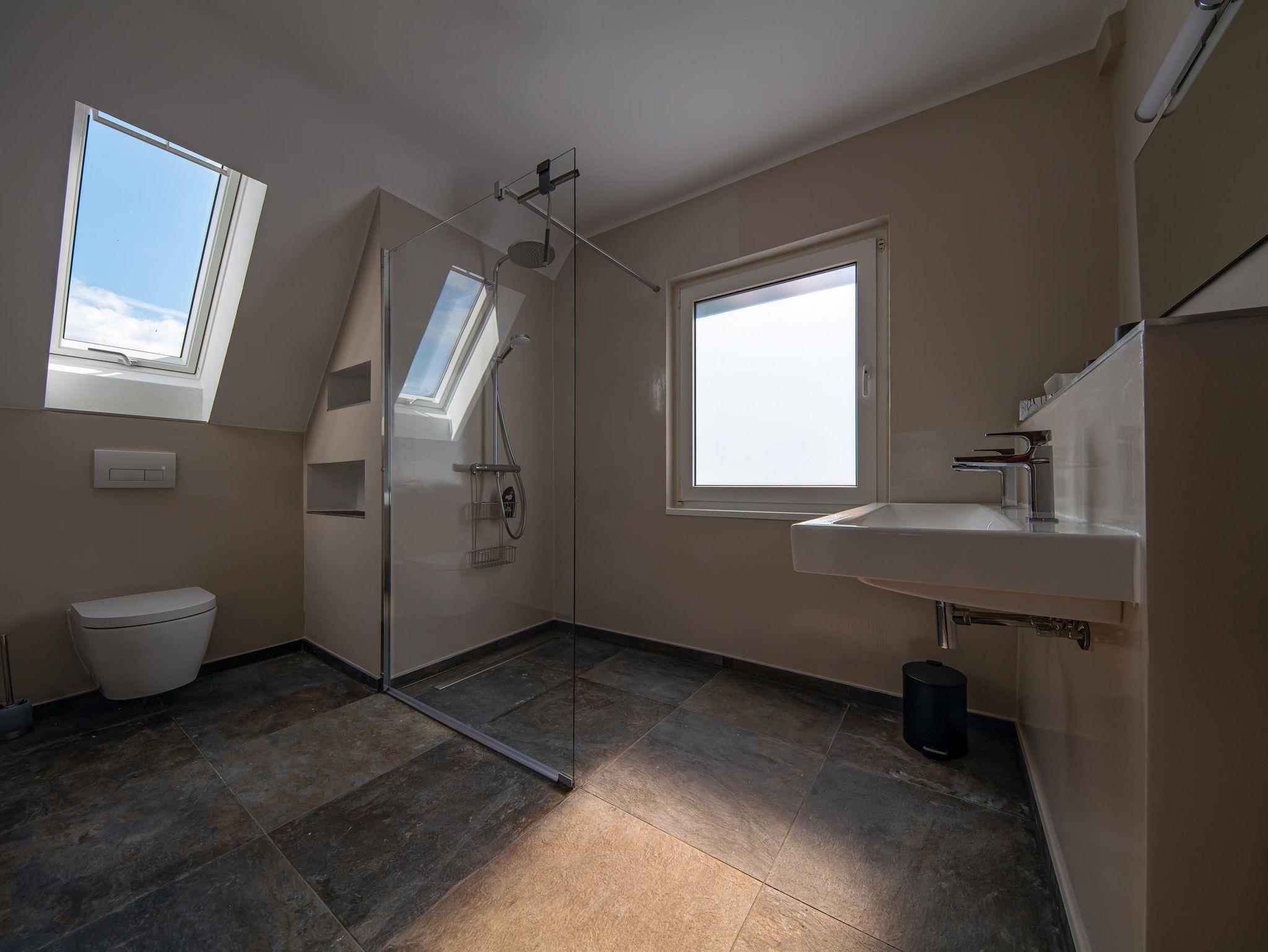 Auch in der zweiten Etage gibt es ein weiteres Bad, ebenfalls mit ebenerdiger Regendusche, Doppelwaschtisch und WC. Für jeden Gast liegen ein großes und ein kleines Handtuch bereit. Natürlich steht auch hier eine Erstausstattung mit Toilettenpapier, Taschentüchern und Handseife zur Verfügung.