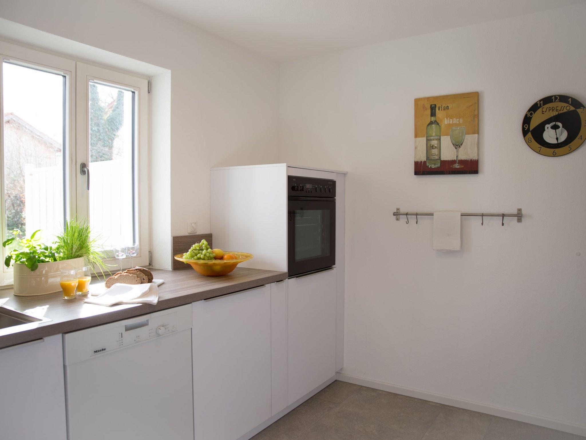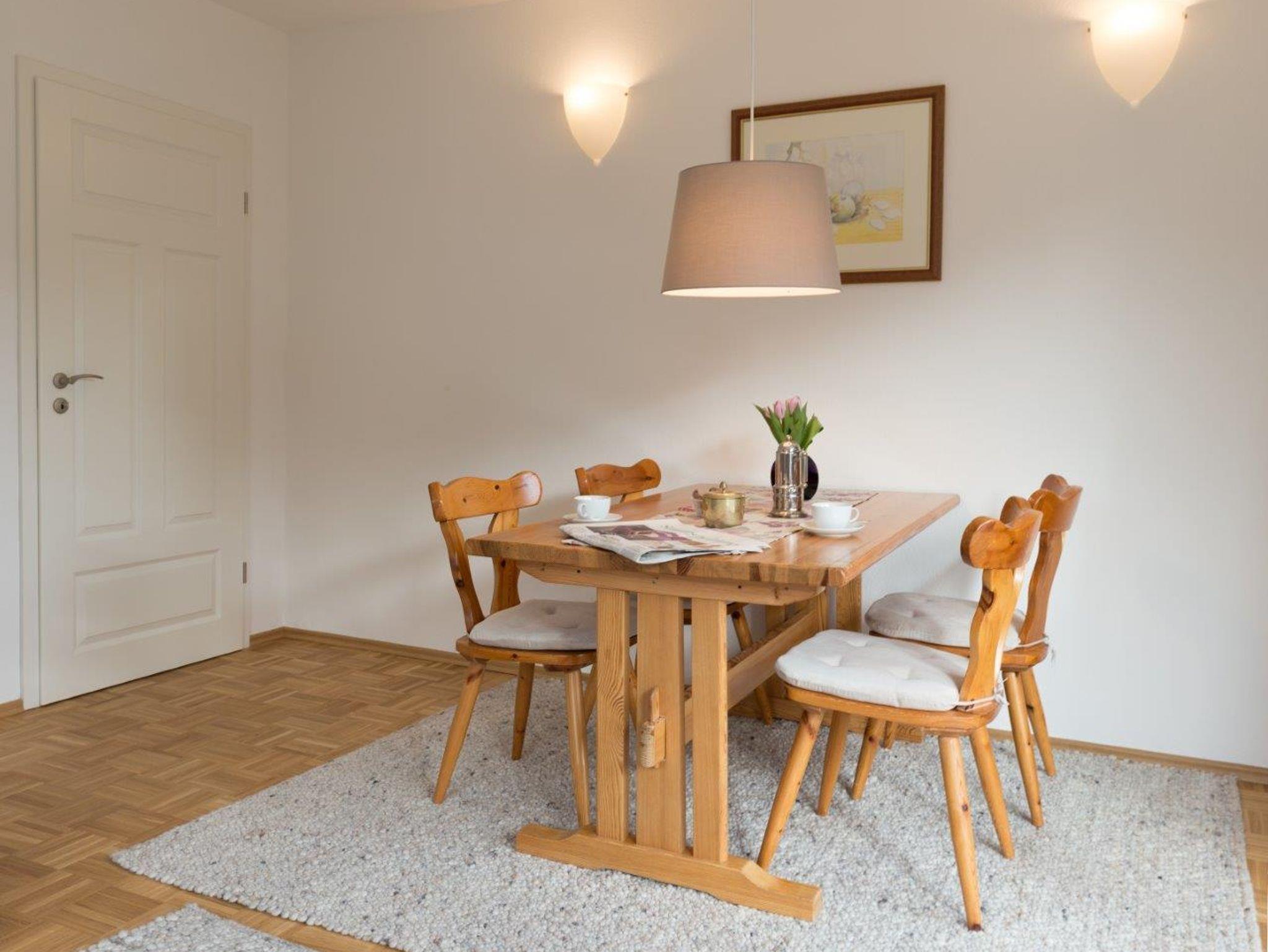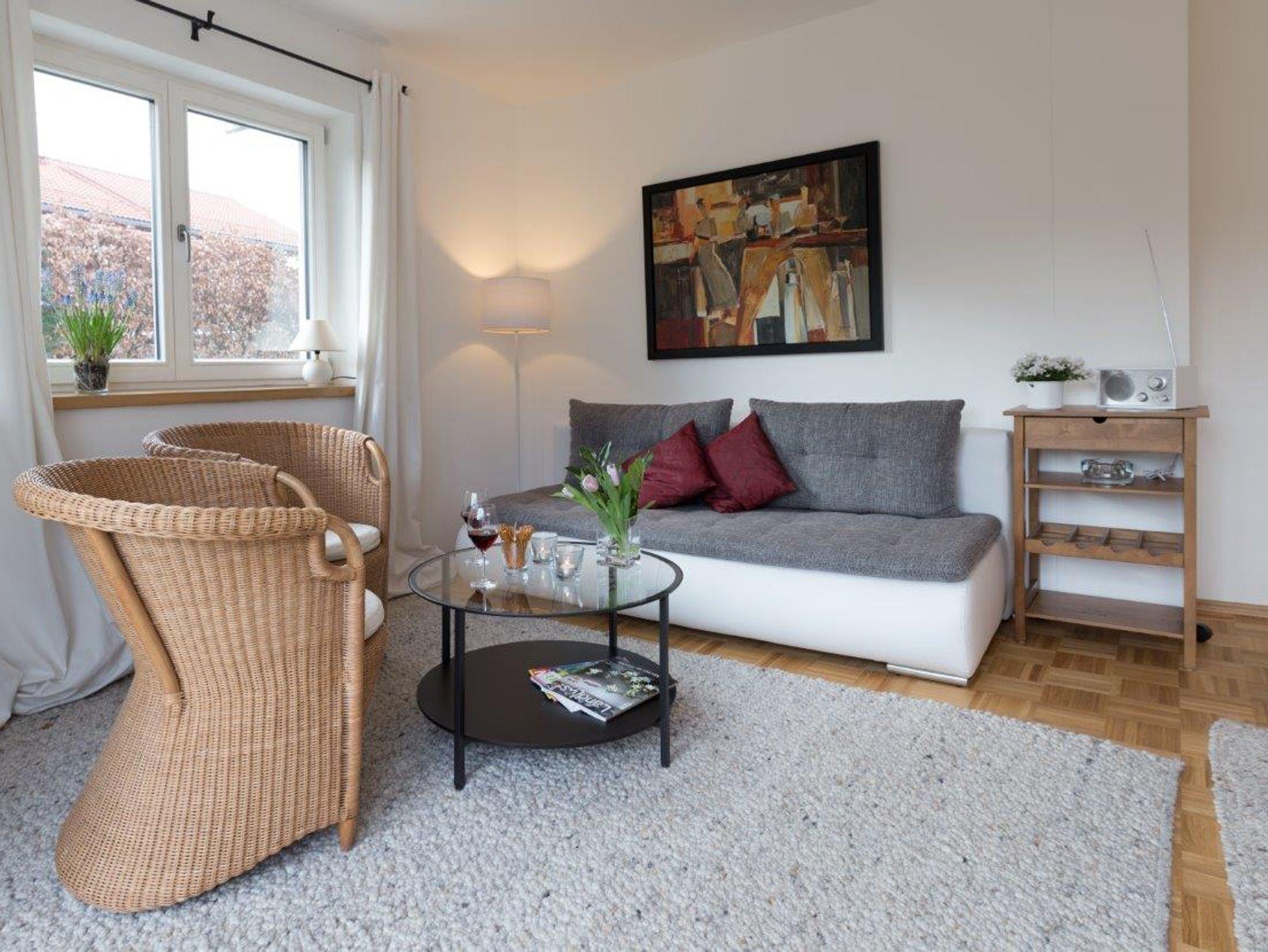 2015 fertiggestellte Ferienwohnung in ruhiger Lage. Über den Wohn- und Essbereich gelangt man direkt auf die Terrasse mit Gartenanteil zum Entspannen. Wer im Urlaub Lust auf Kochen verspürt, findet eine sehr gut ausgestattete Küche, mit Geschirrspüler und Mikrowelle, vor. Fahrräder bzw. Sportausrüstung (z. B. Ski etc.) können im Haus separat und sicher ungergebracht werden. Gastronomie und Einkausmöglichkeit im Ort sind zu Fuß gut erreichbar. Bad mit DU/WC u. Fön, 1 Schlafzimmer und 1 Wohn-/Schlafzimmer, TV, Internet über Wlan/LAN-Verbindung, Parkplatz, 2 Sonneliegen. Wohnung ist bedingt behindertengerecht (schwellenfrei im Wohnbereich), Bettwäsche und Handtücher werden gestellt. Haustiere wegen Allergievermeidung leider nicht möglich.