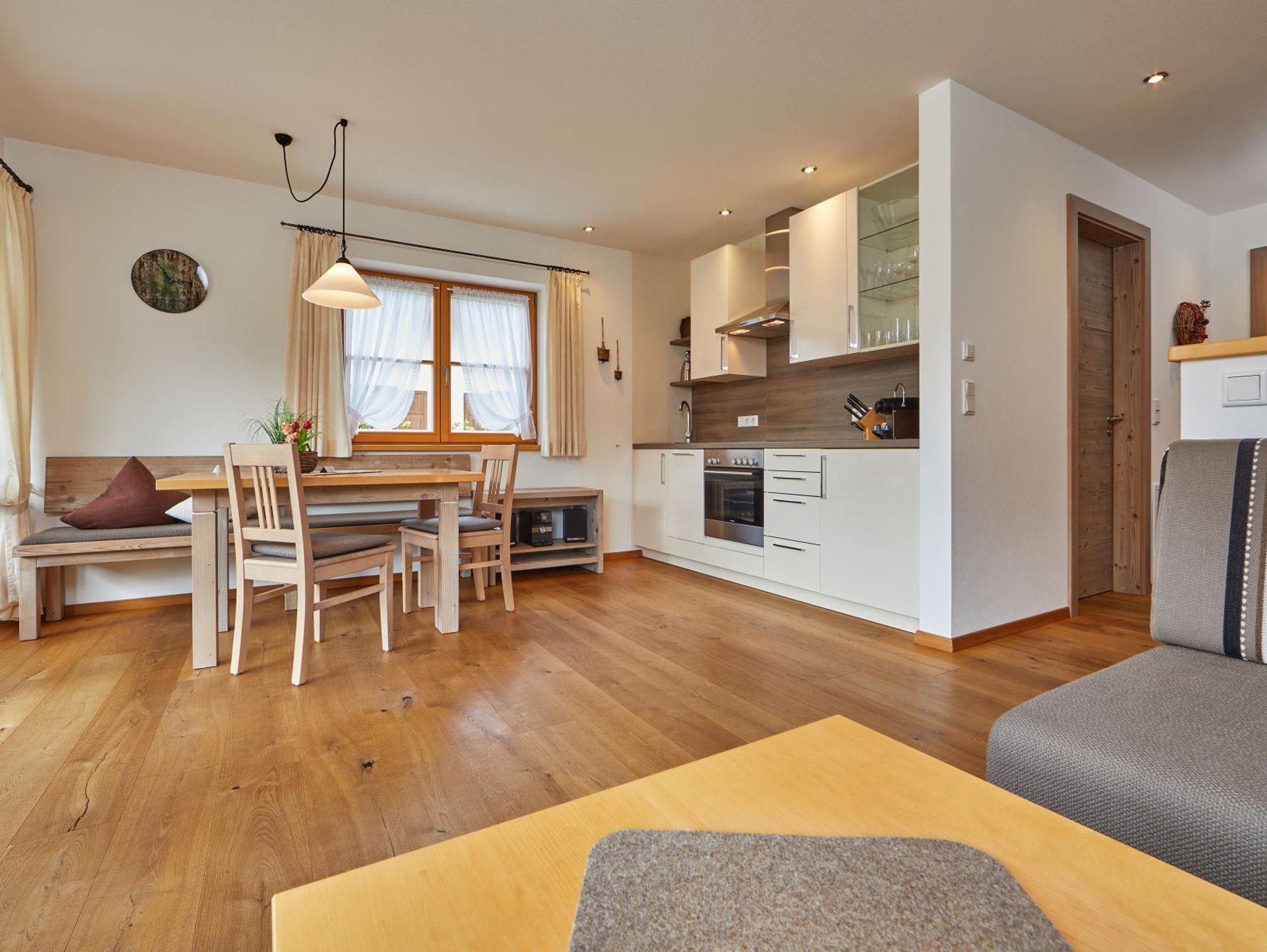 Ferienwohnung im OG mit 50 m² Wohnfläche, Sichtdachstuhl, hochwertige Einrichtung, Schlafzimmer mit Doppelbett, Bad mit Walk-in Dusche, Waschtisch, Handtuchwärmer, Fön, Kosmetikspiegel, schöner Wohn- und Essbereich mit direktem Zugang auf den Süd-Balkon, Einbauküche komplett ausgestattet u.a. mit Geschirrspüler und Ceran-Kochfeld. PKW-Stellplatz.