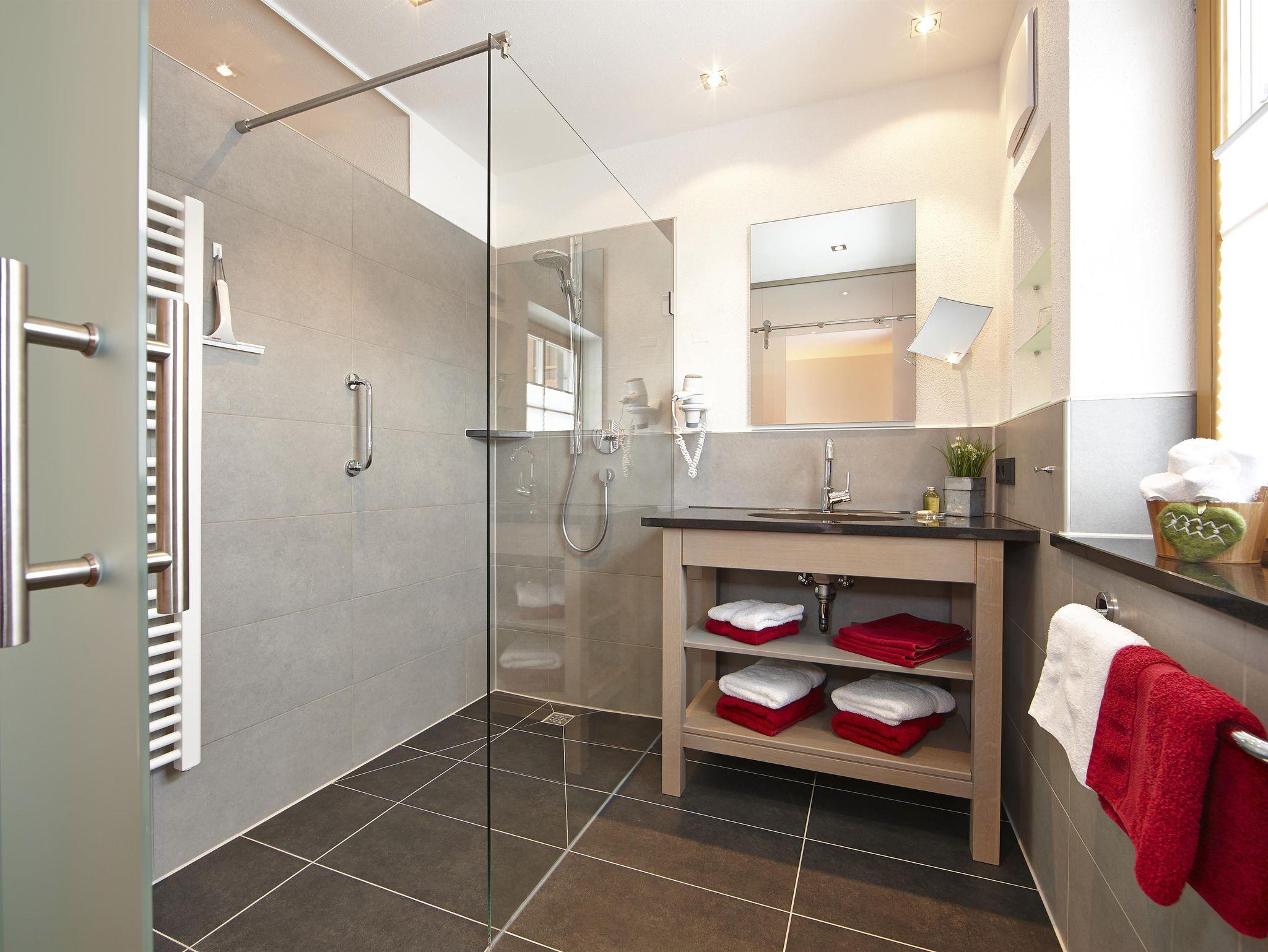 Ferienwohnung im EG mit 85 m² Wohnfläche, hochwertige Einrichtung, Schlafzimmer mit Doppelbett, Bad mit Walk-in Dusche, Waschtisch, Handtuchwärmer, Fön, Kosmetikspiegel. Vom EG führt eine Spindeltreppe ins UG, dort befindet sich ein zweites Schlafzimmer (Tageslicht und Fenster zum Garten) mit einem zusätzlichen Badezimmer. Schöner Wohn- und Essbereich mit direktem Zugang auf die sonnige Terrasse, Einbauküche komplett ausgestattet u.a. mit Geschirrspüler und Ceran-Kochfeld. Zu jeder Wohnung gehört ein PKW-Stellplatz.