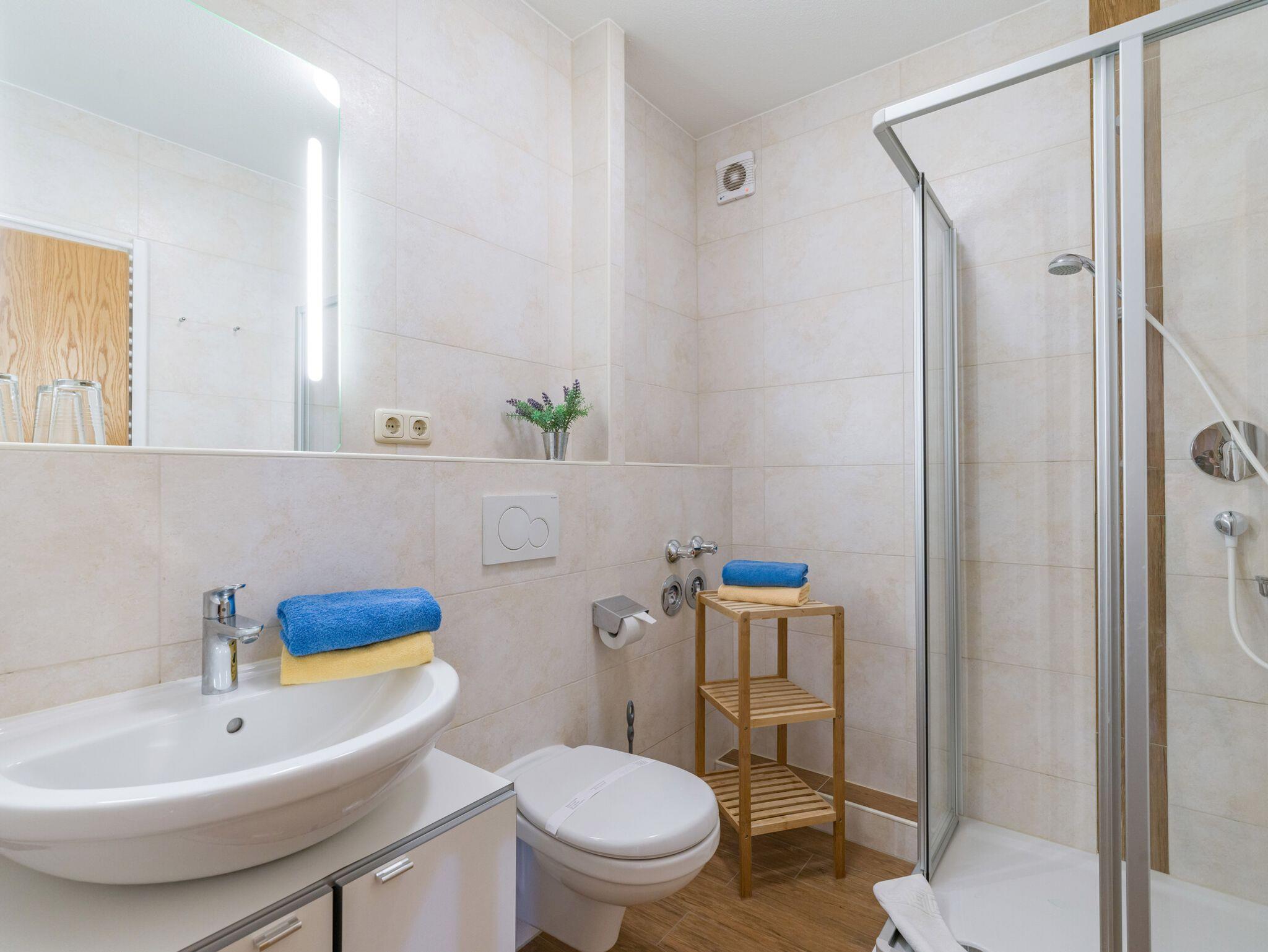 Freundlich eingerichtete Ferienwohnung im Obergeschoss mit separater Küche, neu renovierten Bad mit Dusche , Waschbecken und WC. Das Schlafzimmer ist mit einem Doppelbett und einem Einzelbett ausgestattet. Der helle Wohnraum verfügt über eine gemütliche Essecke , Platz genug für 5 Personen, sowie einer Ausziehcouch für 2 Personen. Der Balkon lädt nach einem ereignisreichen Tag zum Sitzen im Freien ein. Die Küche ist mit einem Backofen , Kühlschrank und einem 4- Plattenherd, sowie Kaffeemaschine, Toaster, Wasserkocher und Küchenutensilien ausgestattet .Die Wohnung liegt in einer familienfreundlichen Anlage mit Spielplatz und Ruheinseln im Garten. Ohne das Haus verlassen zu müssen, haben Sie im Untergeschoss direkten Zugang zu Spielzimmer, Sauna, Fitnessraum und Schwimmbad.