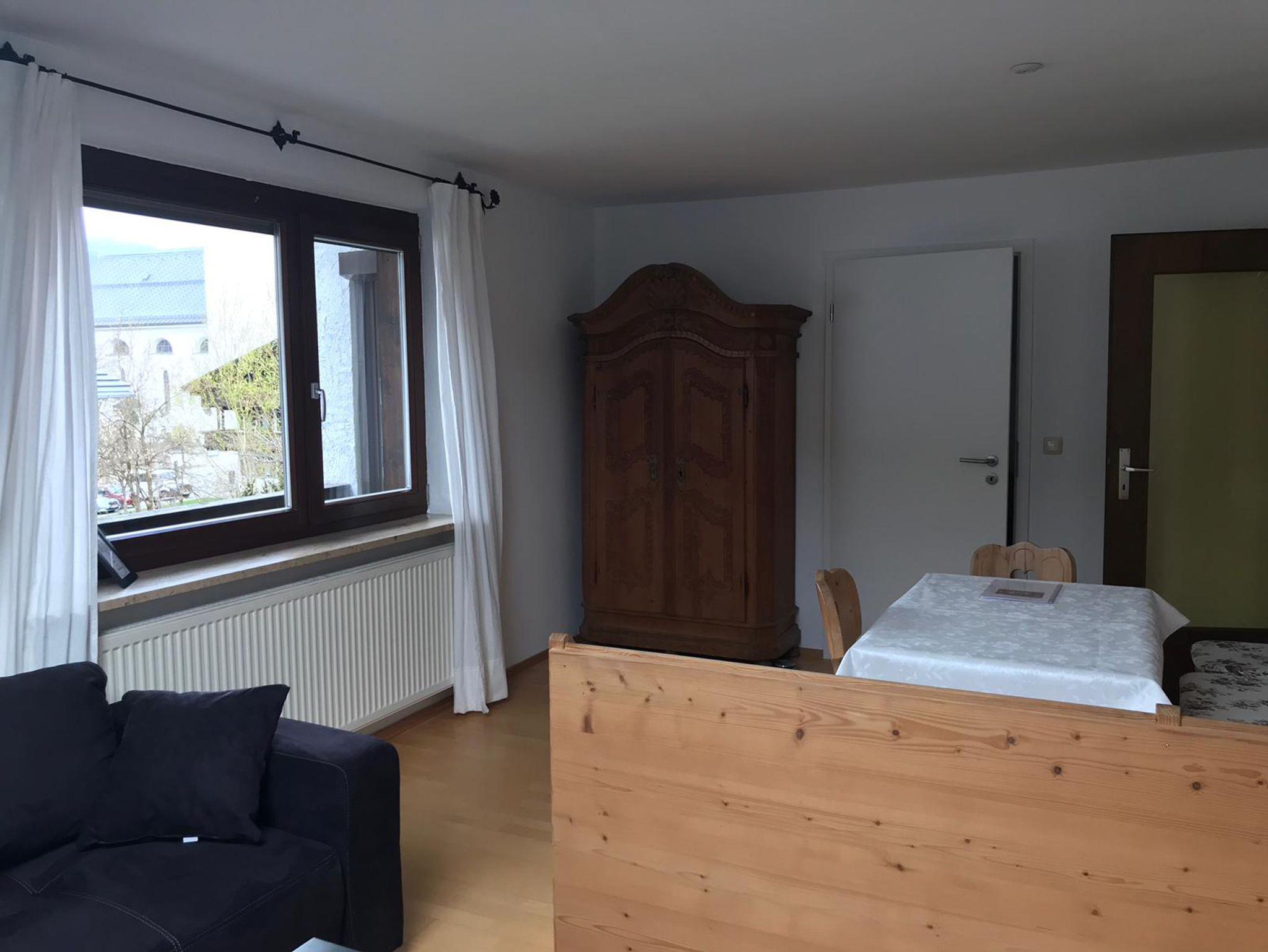 Der andere Bereich des Zimmers ist ein Wohnbereich mit zwei zusätzlichen Sitzecken, die durch das große Fenster den Blick auf den Brünnstein freigibt. Zum Einen eine Sitzecke mit Tisch, die zum Essen oder gemütlichem Zusammensitzen einlädt, zum Anderen eine Couch mit Flachbildfernseher und CD-Player, die zum Entspannen beiträgt. Das Bad mit einer ausladenden Dusche, WC, Föhn und Waschbecken ist frisch renoviert.