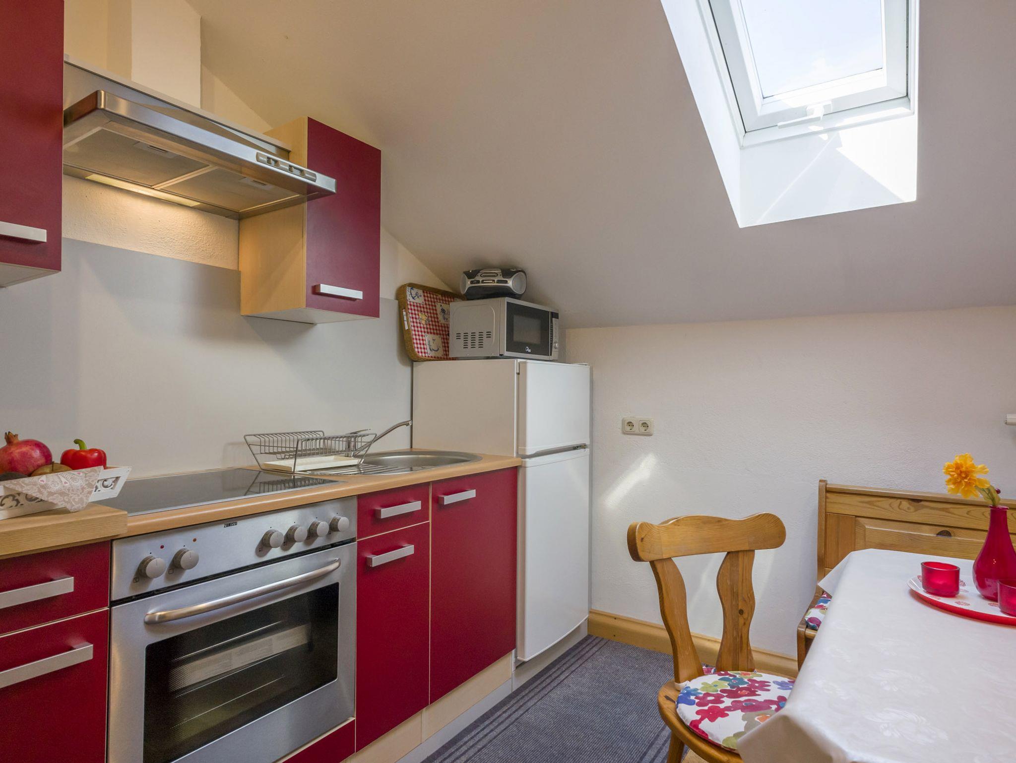 Unsere geräumige Ferienwohnung bietet Ihnen mit 60 Quadratmetern Platz für ein bis fünf Personen. Sie ist in der ersten Etage mit einem separaten Eingang, der über Treppen erreichbar ist. Die neu ausgestattete Küche bietet Ihnen sowohl mit einem Esstisch und einer Sitzecke Raum für ein kleines Frühstück, natürlich mit Kaffee, wie auch für größere Gerichte. Unsere frischen Freiland-Eier erhalten Sie auf Nachfrage für 30ct / Stück, die Sie mit dem vorhandenen Eierkocher praktisch kochen können. Aber keine Sorge, Sie werden nicht von einem krähenden Hahn geweckt. Das Geschirr ist in ausreichender Menge vorhanden. Die Küche ist zudem ausgestattet mit einem Kühlschrank, Hochstuhl, Gefrierfach, Ceranfeld, Backofen, Wasserkocher und Mikrowelle.
