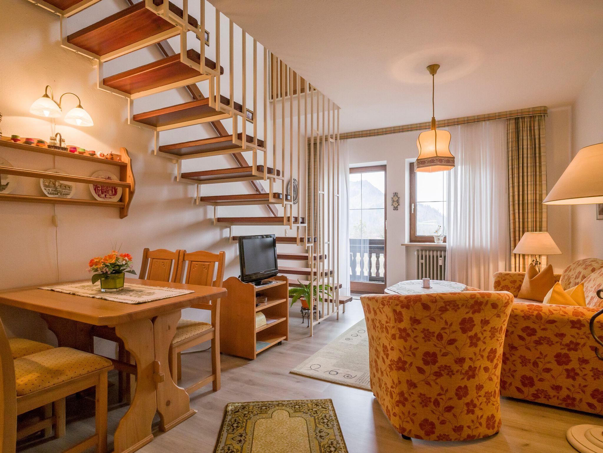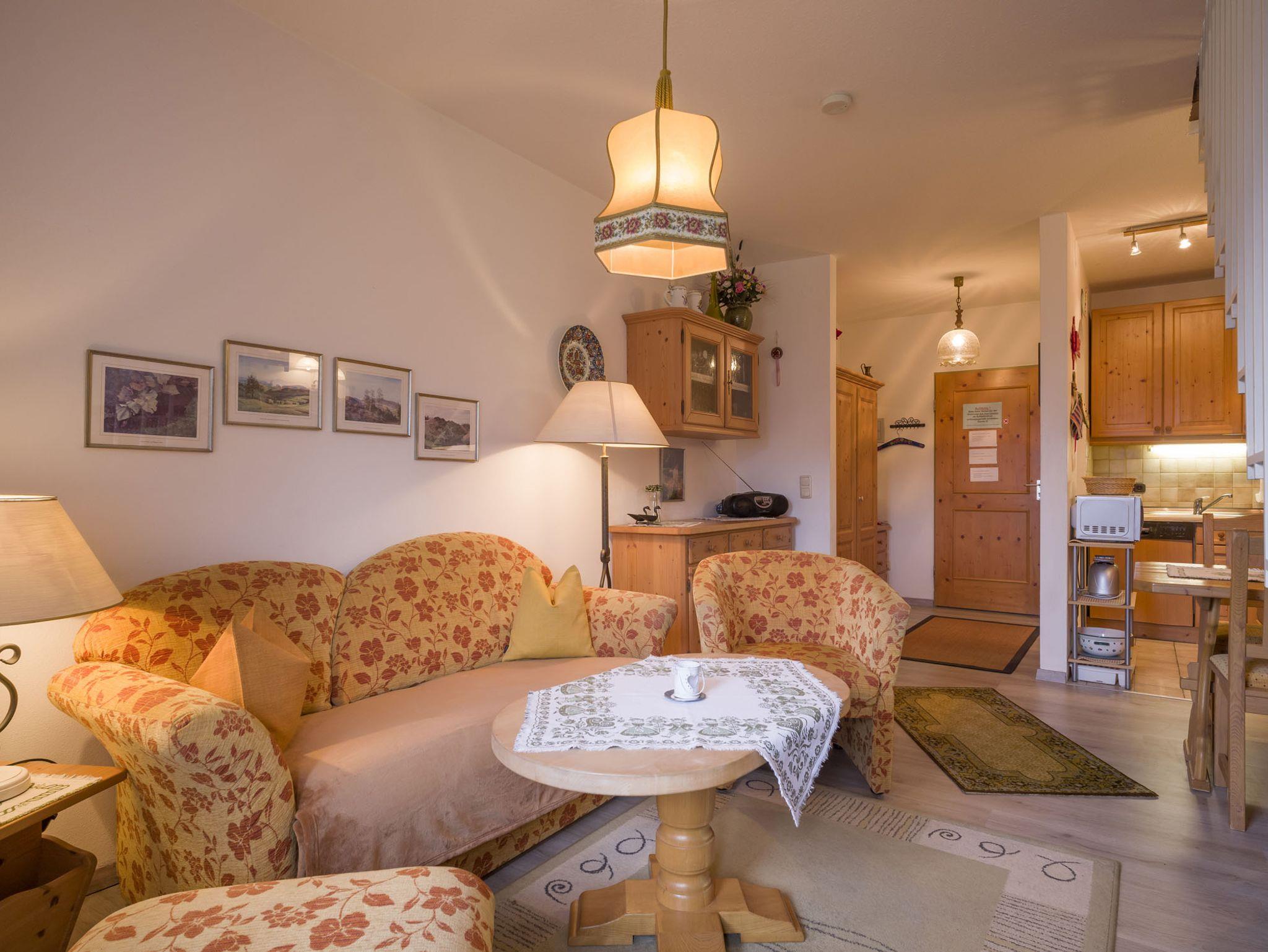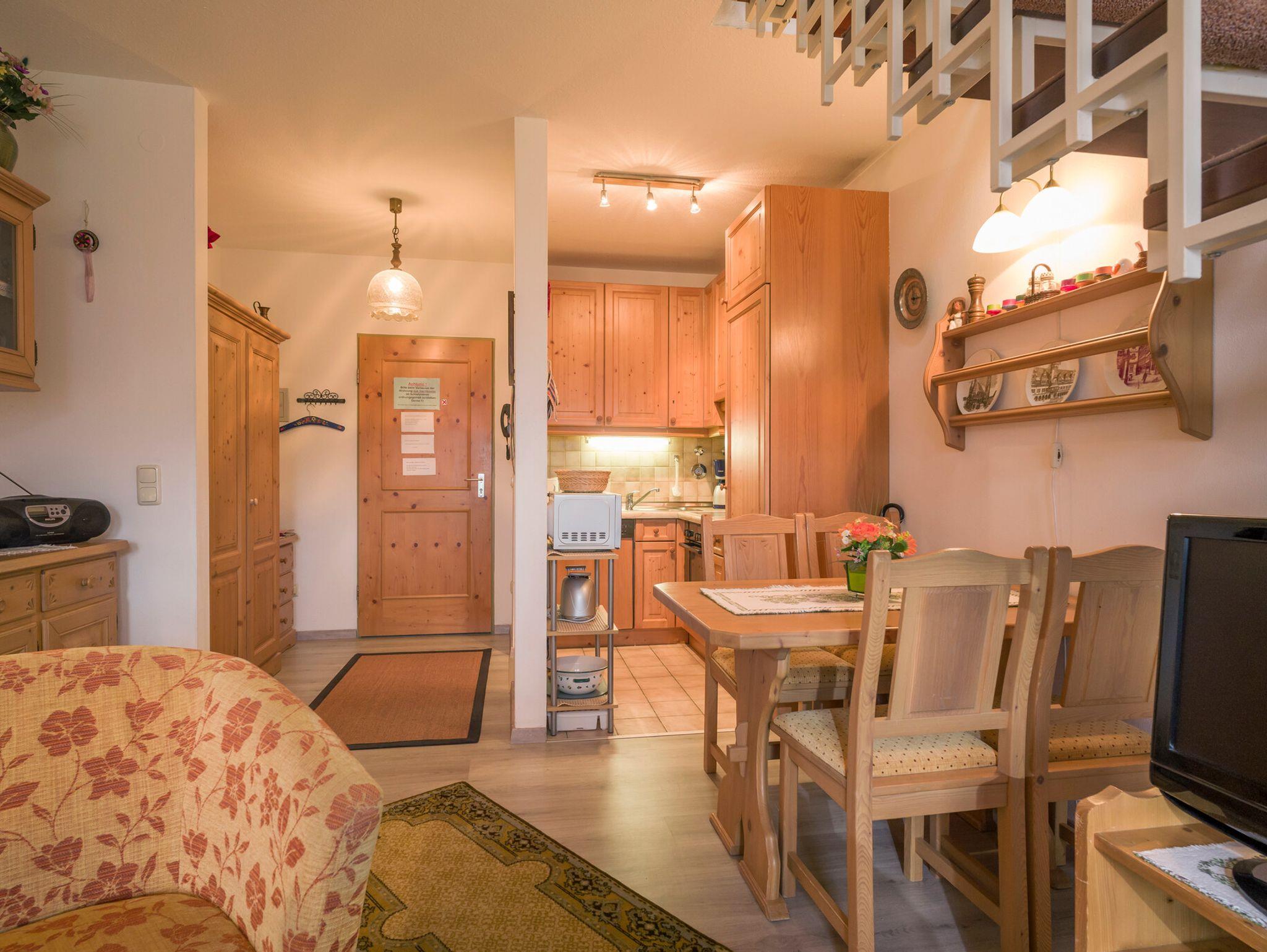 Gemütliche 2-Zimmer-Maisonette-Wohnung, eingerichtet mit Massivholz-Möbeln im Landhaus-Stil. Das Apartment verfügt über ein Wohnzimmer mit Essecke und kleiner Einbau-Küche mit Geschirrspüler, Einbau-Backofen mit Ceran-Kochfeld, sowie Kühl-und Gefrierschrank und Mikrowelle. Eine Treppe führt hoch zum Schlaf-Bereich mit einem Doppelbett und einer zusätzlichen Liege. Hier befindet sich auch die Dusche mit WC extra. Ein Balkon mit herrlicher Aussicht ist ebenfalls vorhanden. Die Wohnung ist für max. 3 Erwachsene geeignet. Zur Ferienwohnung gehört ebenfalls ein eigener Garagenstellplatz.