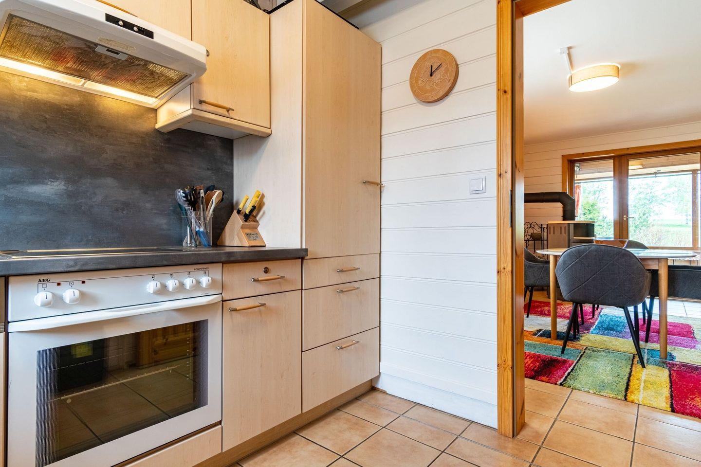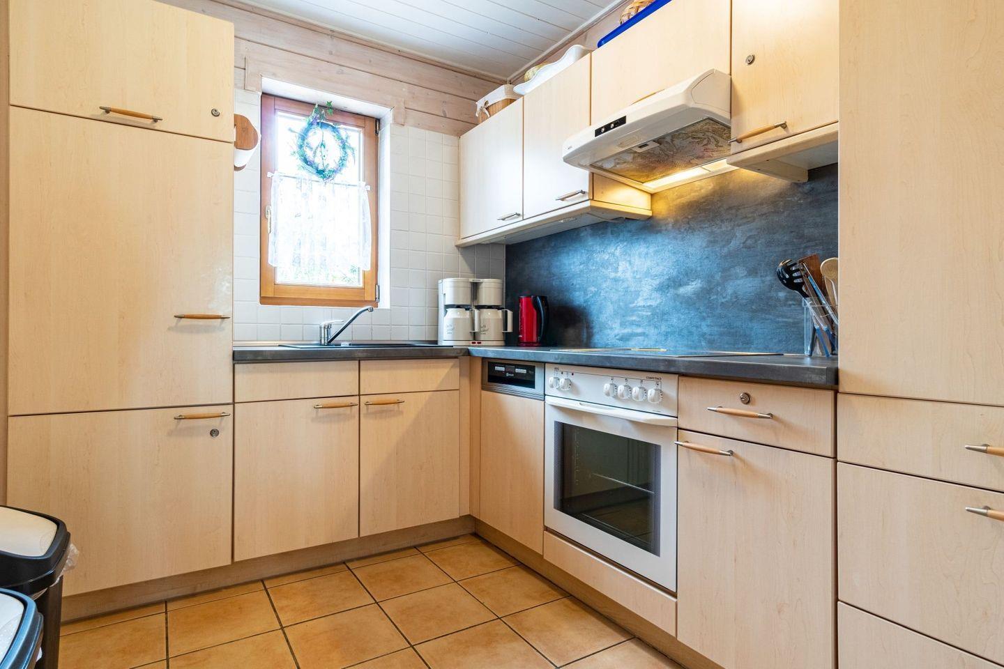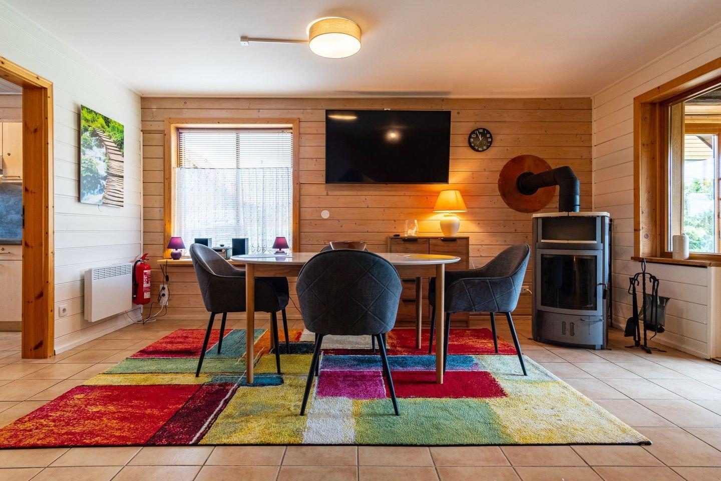 Dieses Ferienhaus besticht durch seinenCharme kombiniert mit modernen Annehmlichkeiten. Der offene Wohnbereich lädt mit einem stilvollen Sofa, einem Kaminofen und einem Essbereich zu gemütlichen Abenden ein. Hier können Sie entspannte Stunden verbringen oder mit Ihren Liebsten ein Spiel spielen. Die gut ausgestattete Küche bietet alles, was Sie für Ihre Selbstversorgung benötigen. Ein Cerankochfeld, Backofen, Kühlschrank mit Gefrierfach und Geschirrspüler stellen sicher, dass es Ihnen an nichts mangelt.