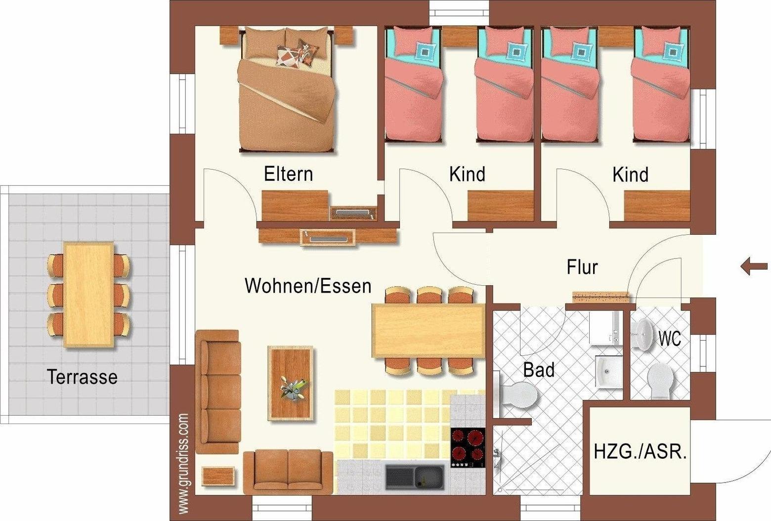 Folgende Räume befinden sich im Haus: Flur / Eingang, Gäste-WC, Duschbad, Schlafimmer I mit 2 Boxspringbetten, Schlafzimmer II ebenfalls mit 2 Boxsprongbetten, Schlafzimmer III mit einem Doppelbett / Boxspoingbett, Wohn- Ess- und Küchenbereich, große überdachte Terrasse, Geräteraum. Alles ist Modern und Voll ausgestattet.