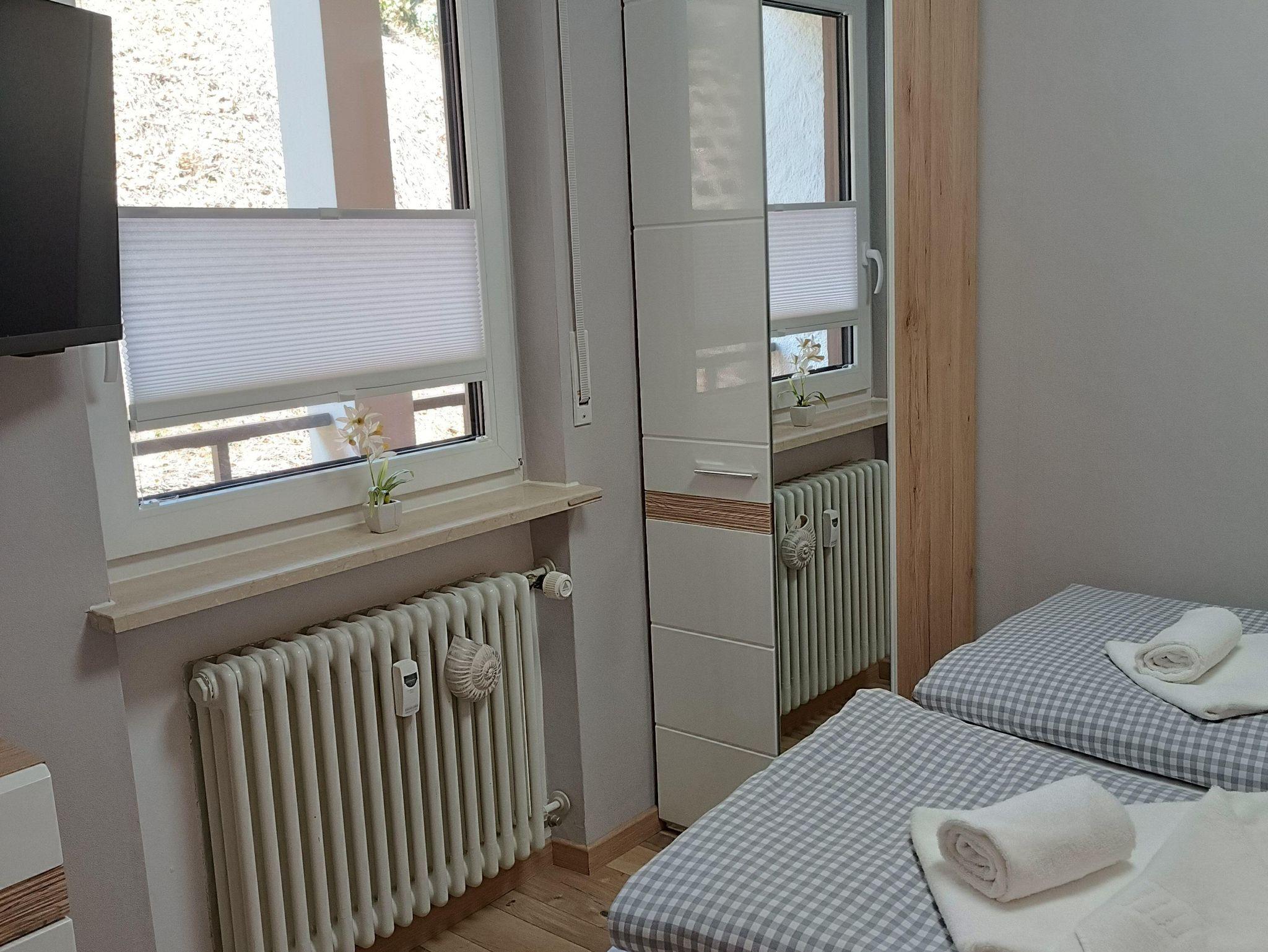 Der Raumgröße geschuldet steht das Bett an der Wand, sodass der Ausstieg nur auf einer Seite möglich ist.