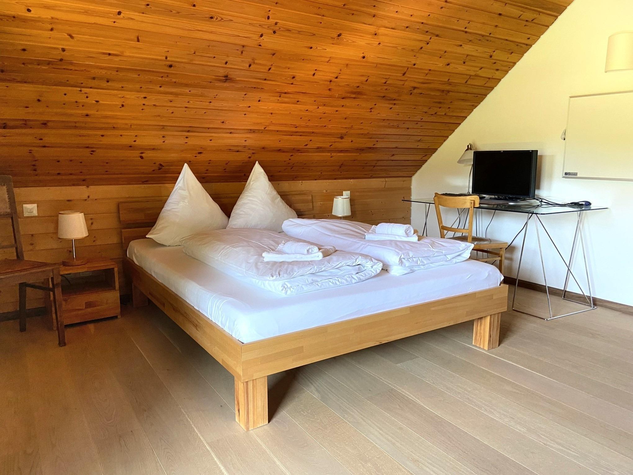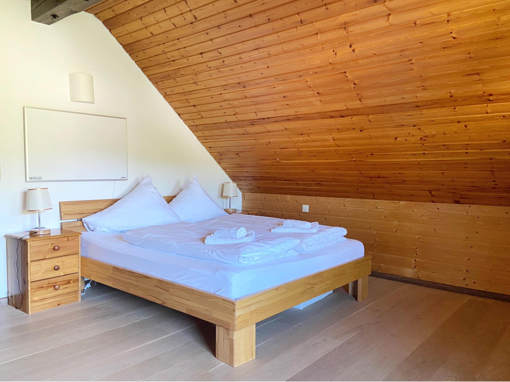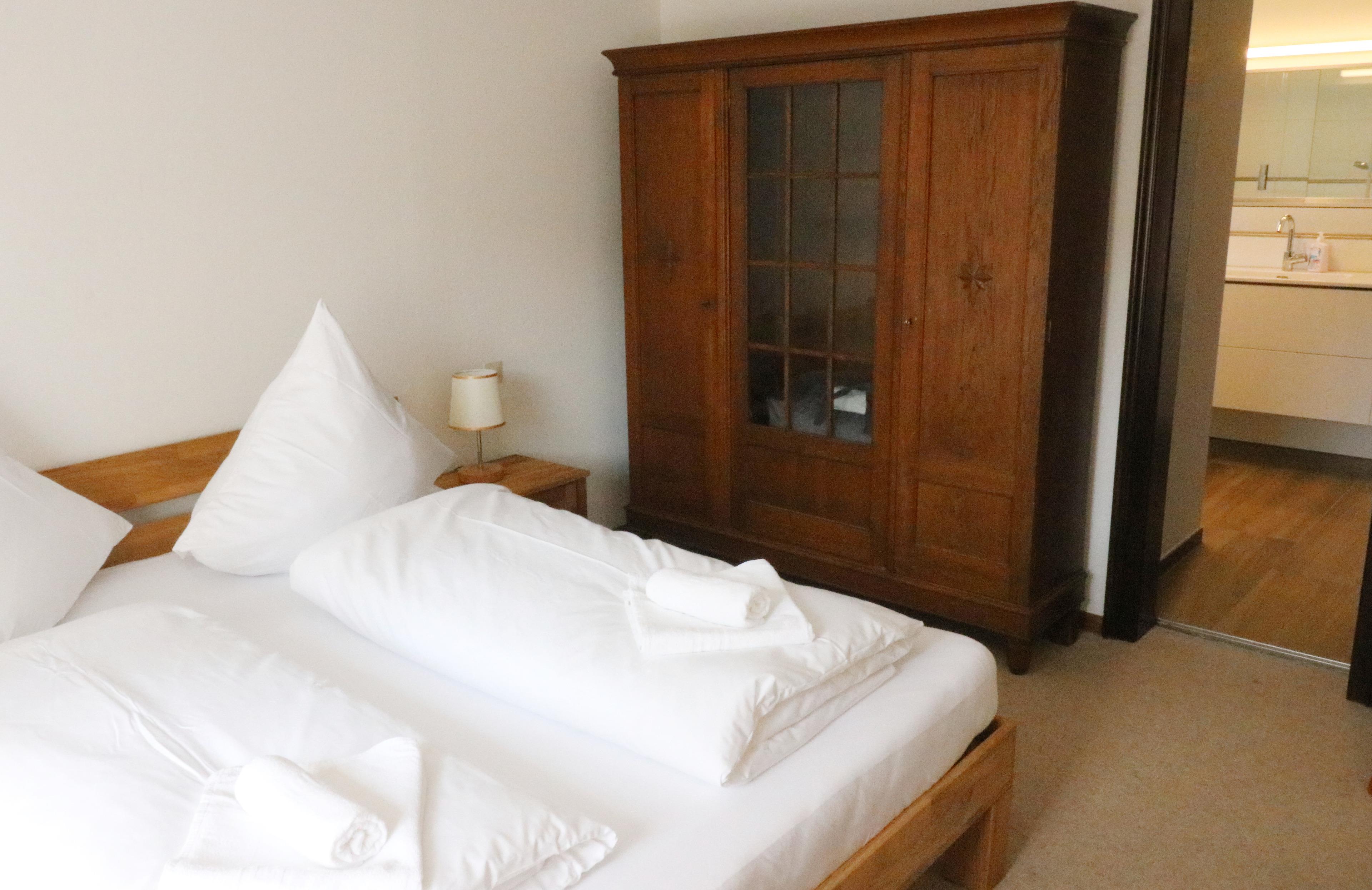 - Schlafzimmer 1 (für 2 Personen): 1 Doppelbett, Schrank, Schreibtisch und direkter Zugang zum Badezimmer