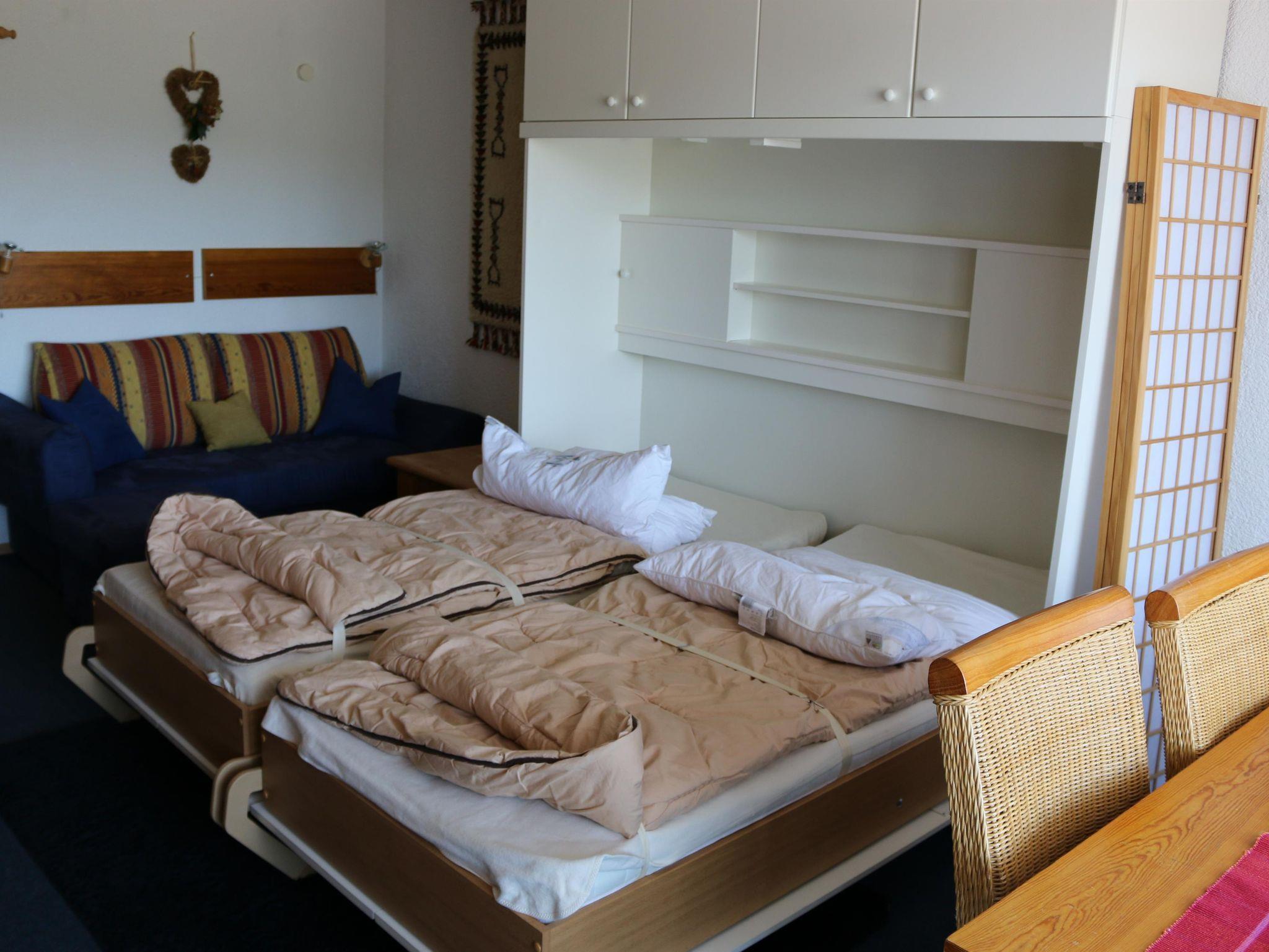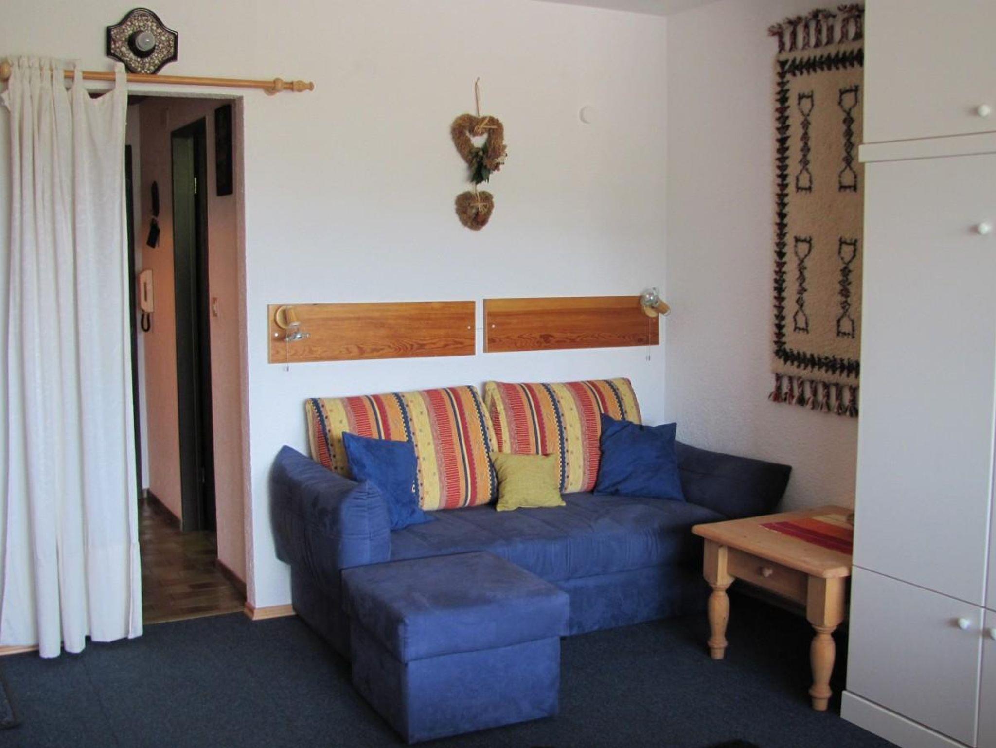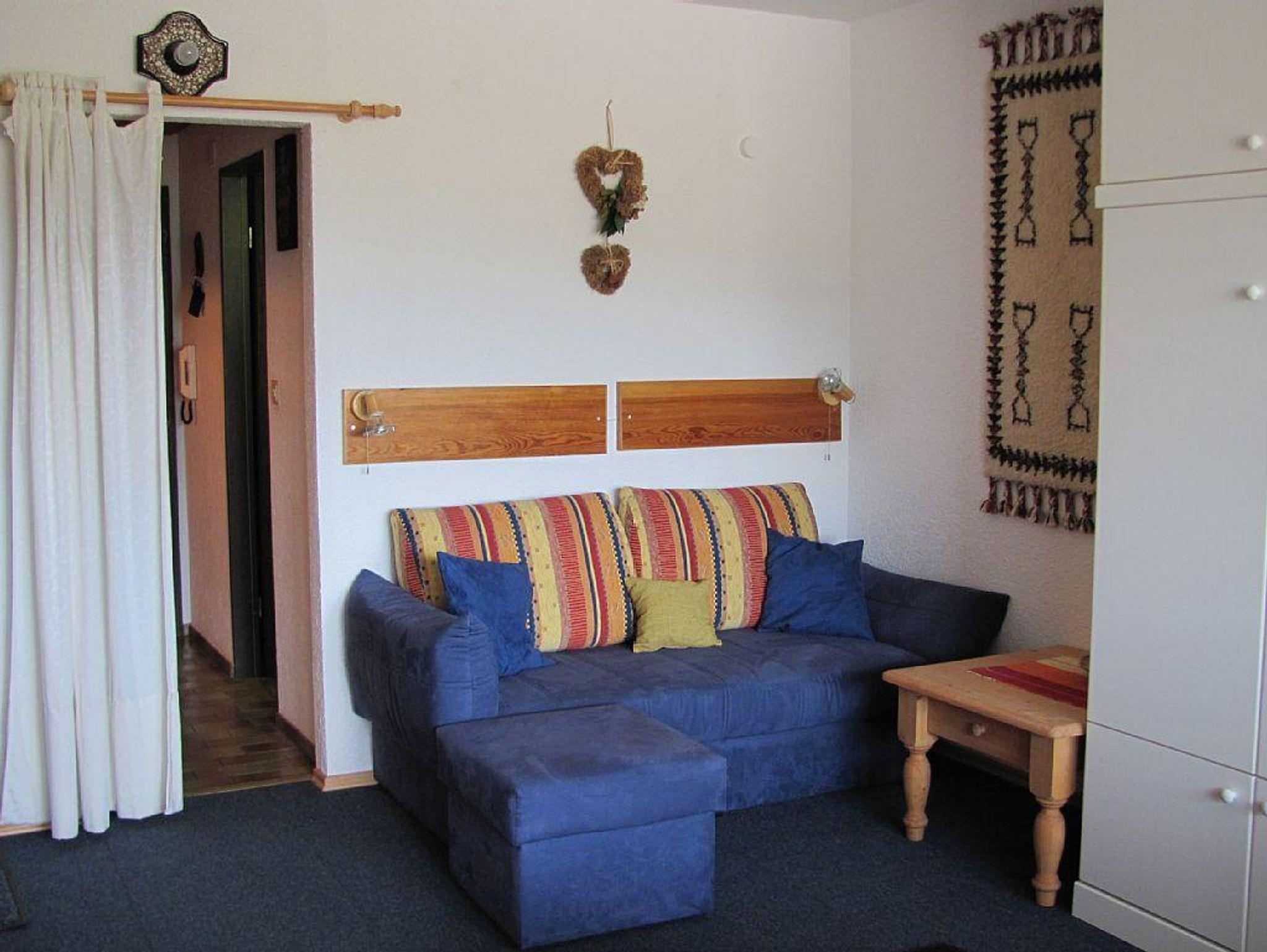 Im Eingangsbereich befindet sich die Kochnische mit Spüle, 4-Plattenherd mit Heißluftofen, Kaffeemaschine und Wasserkocher. Es ist genügend Geschirr und Besteck vorhanden. An der Wand ist ein Regal mit Gewürzen. Im Badezimmer sind Dusche, Waschbecken und WC. Das Badezimmer ist neu renoviert. Im Wohn-Schlafraum ist ein Vollholzschrank mit zwei Kleiderstangen und jeweils Ablageflächen. Im rechten Schrankoberteil finden Sie Polster für die Balkonstühle. Daneben ist ein Unterschrank aus Vollholz mit Gläsern. Auf diesem Unterschrank stehen der Flachbildschirm und ein Videorekorder. In dem Regal darüber ist die Stereoanlage (Radio und CD-Player). Der Esstisch ist ebenfalls aus Vollholz. Dazu gibt es drei Stühle mit Polstern und einen niedrigeren Sessel mit hoher Lehne. Die Betten können tagsüber hochgeklappt werden. So haben Sie genug Platz zum Wohnen. Eine Sitzecke mit Schlafcouch, Couchhocker und -tisch lädt zum Ausruhen ein. Schwimmbad, beheizter Skischuhraum,Ski/Fahrradkeller im Haus