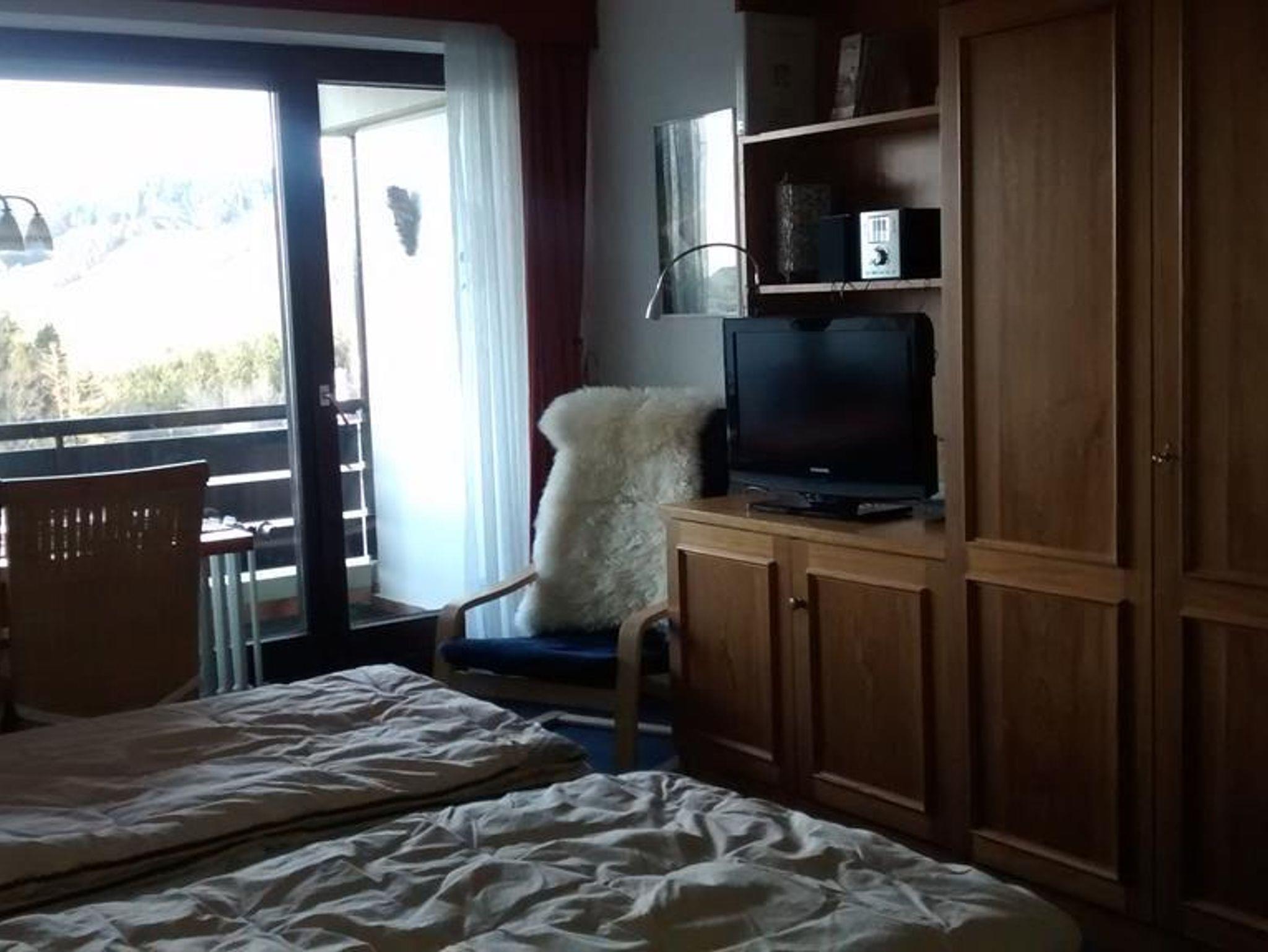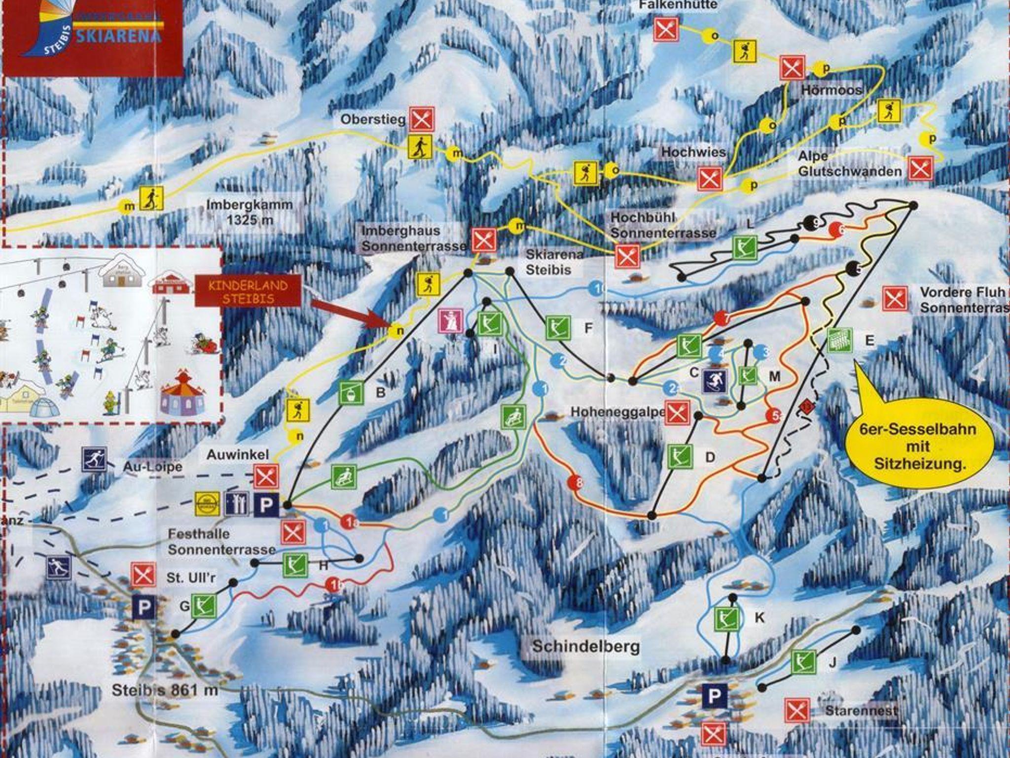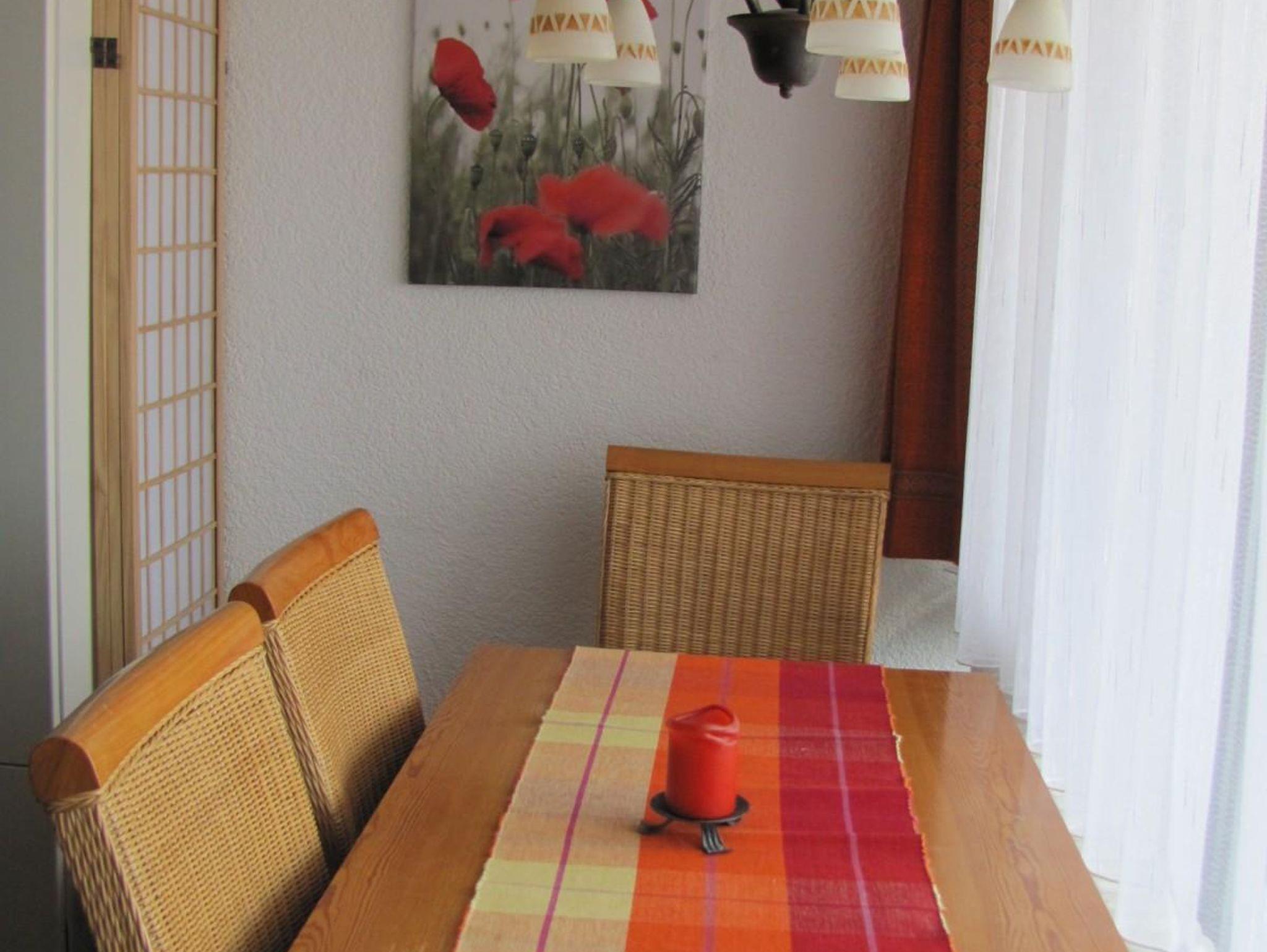 Im Eingangsbereich befindet sich die Kochnische mit Spüle, 4-Plattenherd mit Heißluftofen, Kaffeemaschine und Wasserkocher. Es ist genügend Geschirr und Besteck vorhanden. An der Wand ist ein Regal mit Gewürzen. Im Badezimmer sind Dusche, Waschbecken und WC. Das Badezimmer ist neu renoviert. Im Wohn-Schlafraum ist ein Vollholzschrank mit zwei Kleiderstangen und jeweils Ablageflächen. Im rechten Schrankoberteil finden Sie Polster für die Balkonstühle. Daneben ist ein Unterschrank aus Vollholz mit Gläsern. Auf diesem Unterschrank stehen der Flachbildschirm und ein Videorekorder. In dem Regal darüber ist die Stereoanlage (Radio und CD-Player). Der Esstisch ist ebenfalls aus Vollholz. Dazu gibt es drei Stühle mit Polstern und einen niedrigeren Sessel mit hoher Lehne. Die Betten können tagsüber hochgeklappt werden. So haben Sie genug Platz zum Wohnen. Eine Sitzecke mit Schlafcouch, Couchhocker und -tisch lädt zum Ausruhen ein. Schwimmbad, beheizter Skischuhraum,Ski/Fahrradkeller im Haus
