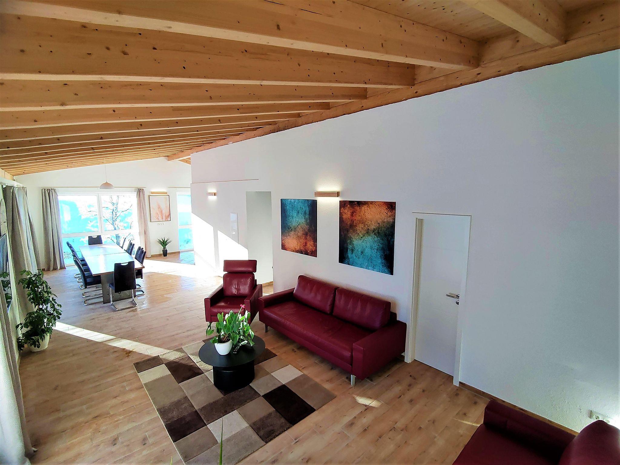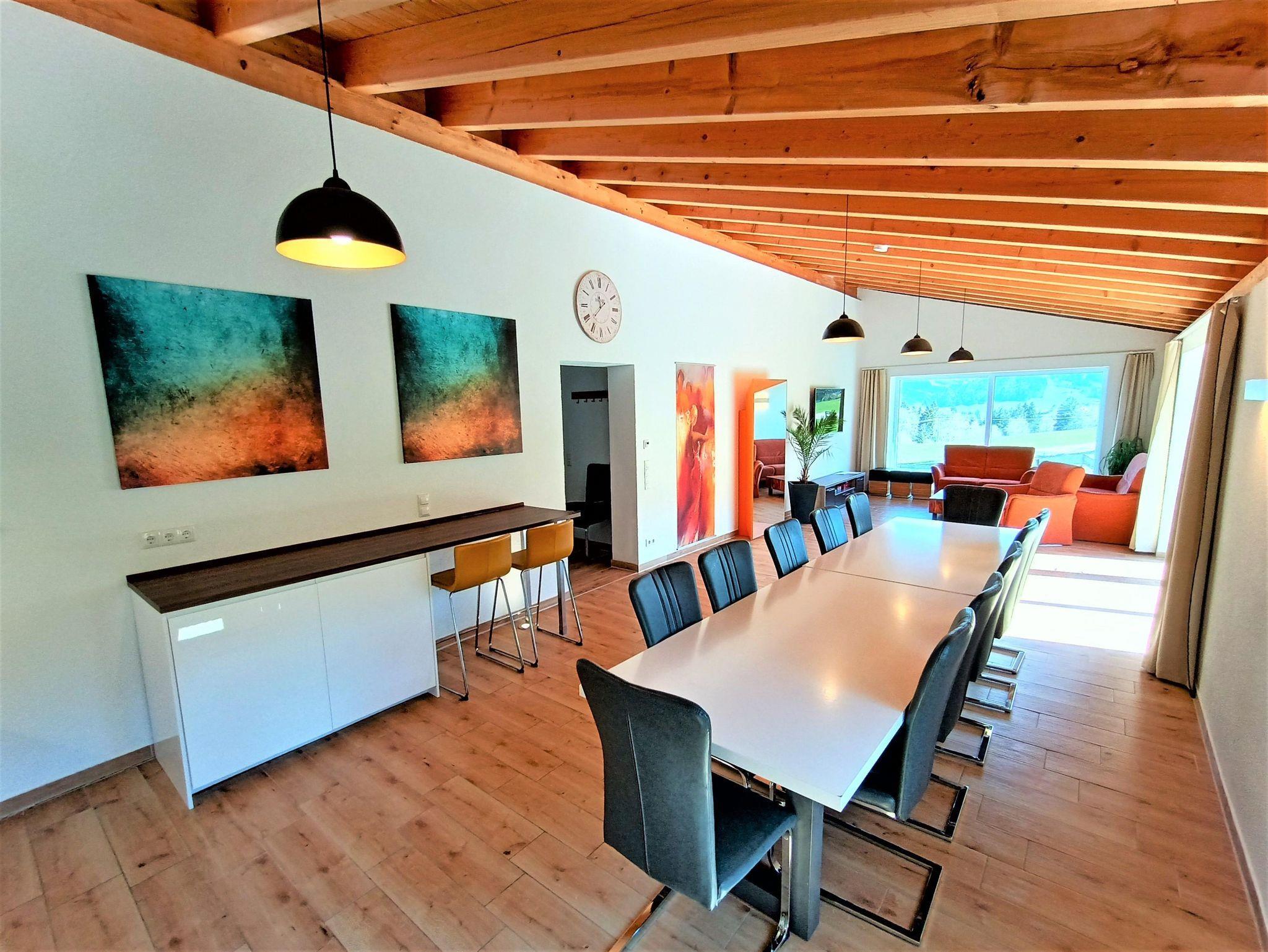 Riesiger Wohn/Essbereich für´s Beisammensein der Großfamilien, fünf separate Schlafzimmer (für 13 Erwachsene + 3 Babybetten), Infrarotsauna für 4 Personen, 2 Bäder, 2 separate WC-Räume, Fußbodenheizung, 55 Zoll Smart TV, eine Kinderspielecke, große Südterrasse zur Alleinnutzung, eigene Auffahrt, separater Eingang, eigener Hang, separater Stellplatz uvm. lassen keine Wünsche offen.