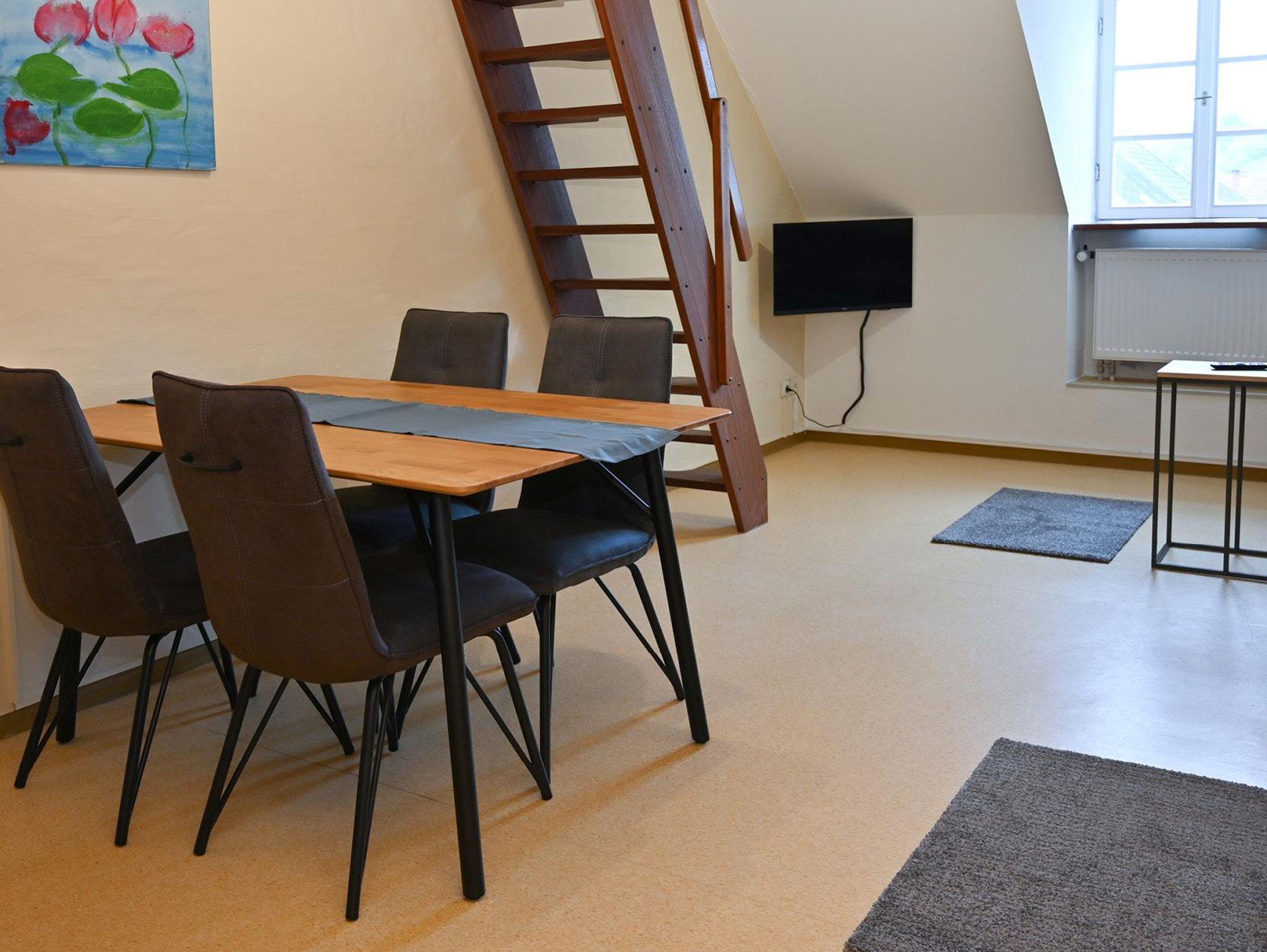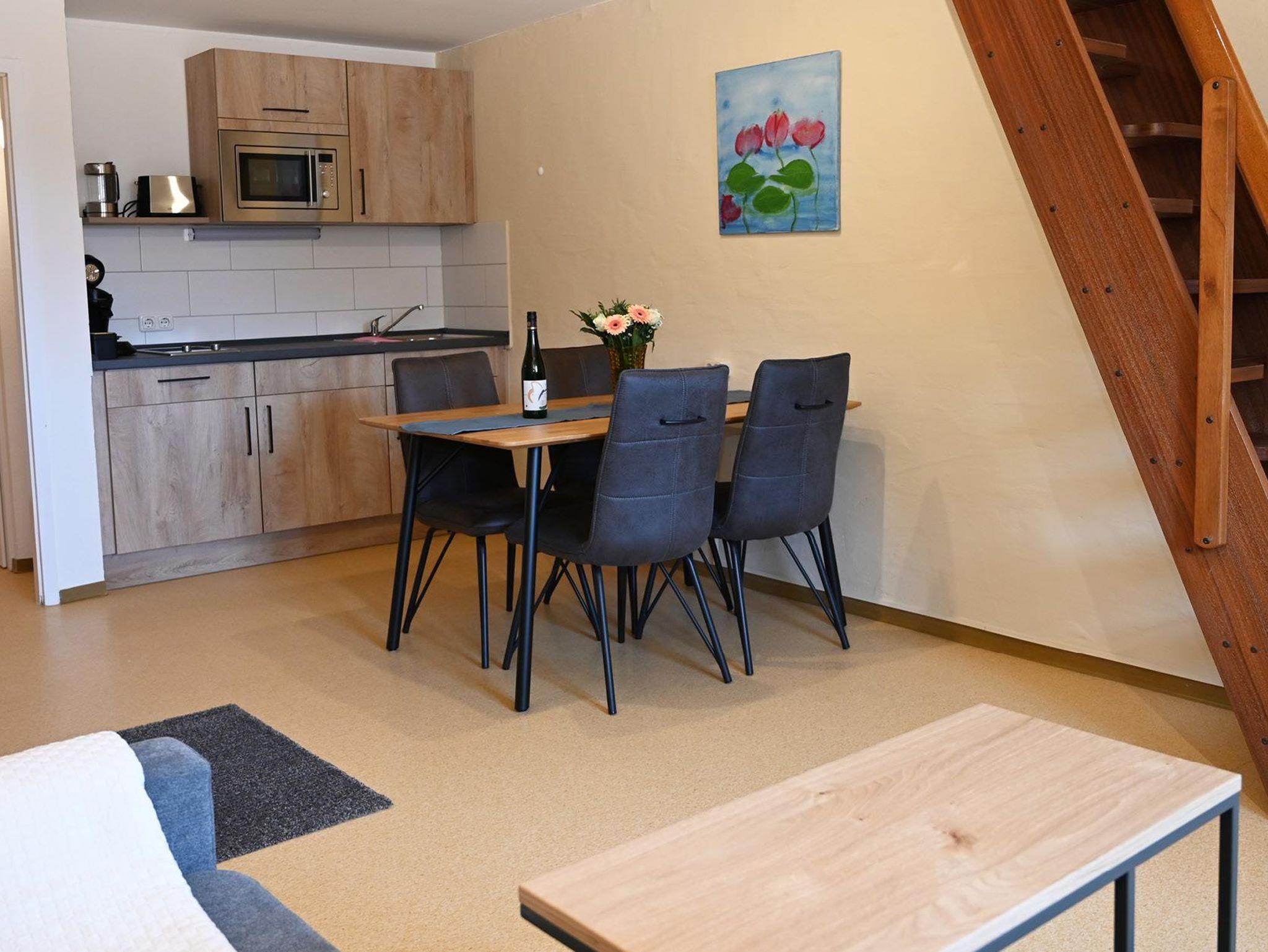 5 Appartements sind bei einer Größe von etwa 37 qm für 2 bis 4 Personen ausgelegt. Jedes Appartement ist mit einem SAT-TV und einer Schlafcouch ausgestattet und verfügt über eine komplett eingerichtete Küche mit Mikrowelle, Herd, Kühlschrank, Wasserkocher, Kaffeemaschine und Toaster. Ein Esstisch mit 4 Stühlen lädt zum gemütlichen Beisammensein ein. Im Schlafbereich finden Sie ein bequemes Doppelbett sowie einen Kleiderschrank. Das moderne Duschbad ist zusätzlich mit einem Föhn ausgestattet. Bitte beachten Sie, dass wir kein Essen oder Frühstück anbieten, da unsere Appartements für Selbstversorger ausgelegt sind.