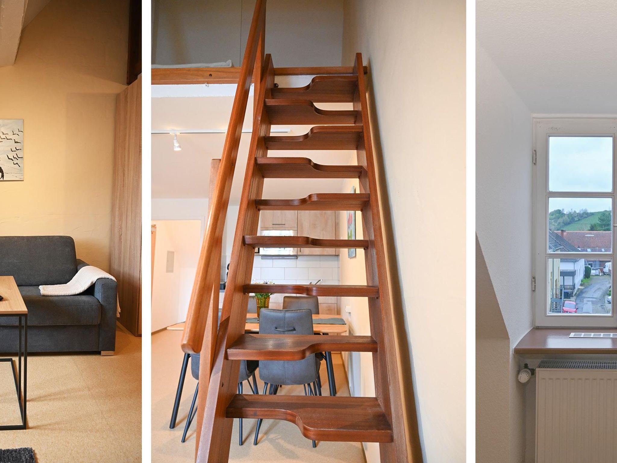 Das Appartement Krähennest verfügt über eine Klimaanlage und befindet sich im 2. Obergeschoss. Auf ca. 39 qm befinden sich 1 Flur, 1 Bad mit WC und Dusche, 1 Wohn-/Esszimmer mit Küche und eine Empore, auf der sich das Schlafzimmer mit 2 Einzelbetten befindet. Dieses ist über eine Treppe, die vom Wohn-/Esszimmer nach oben führt, erreichbar.
