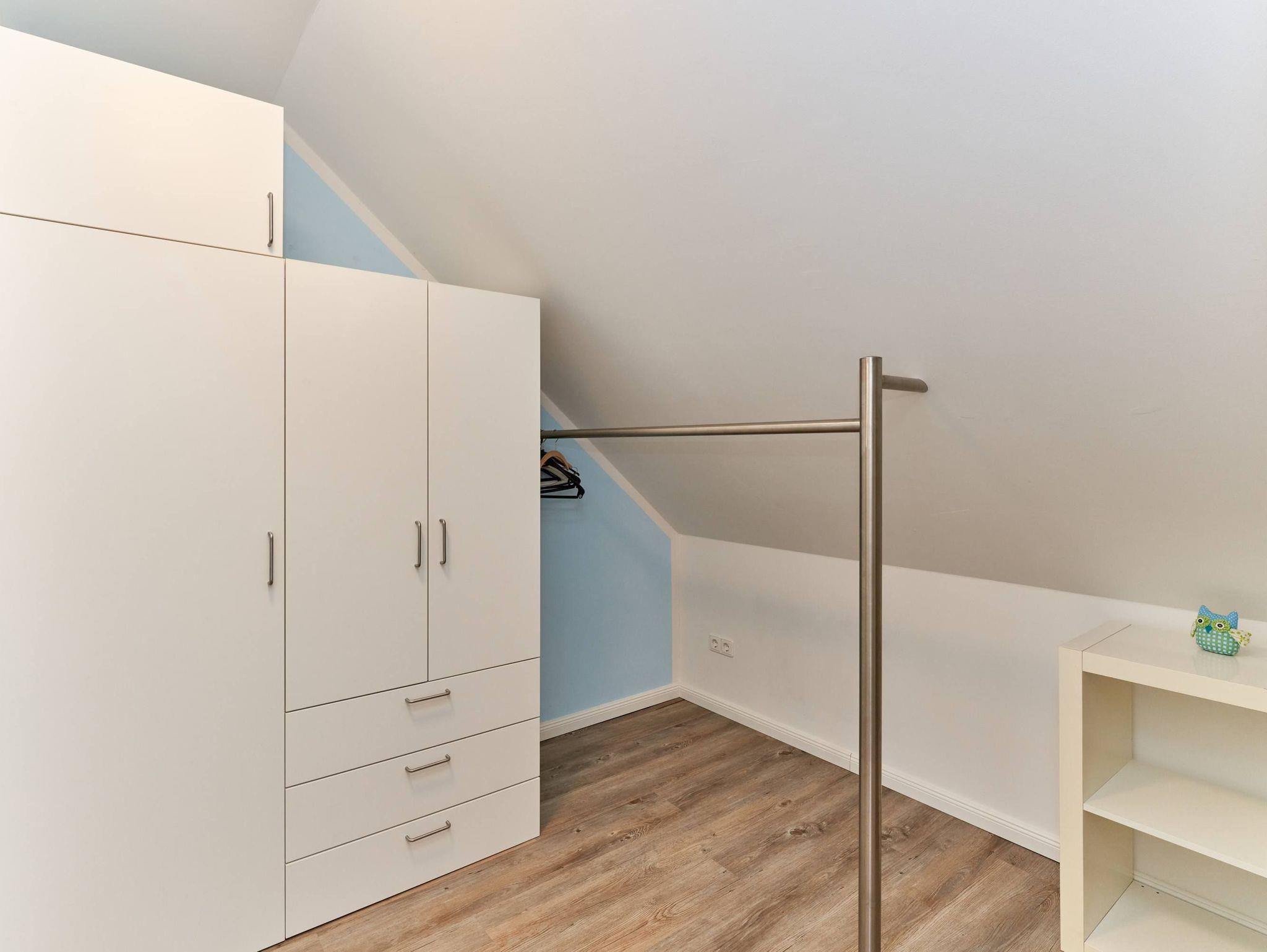 Im Dachgeschoss befinden sich zwei gemütliche Schlafzimmer, die Ihnen eine erholsame Nachtruhe garantieren. Zudem erwartet Sie ein großes Badezimmer mit separater Badewanne und Dusche, Toilette und Waschbecken ideal für entspannende Wellnessmomente nach einem aktiven Tag an der Nordsee. Ein Ankleidezimmer bietet Ihnen zusätzlichen Stauraum für Ihre Kleidung und persönlichen Dinge.