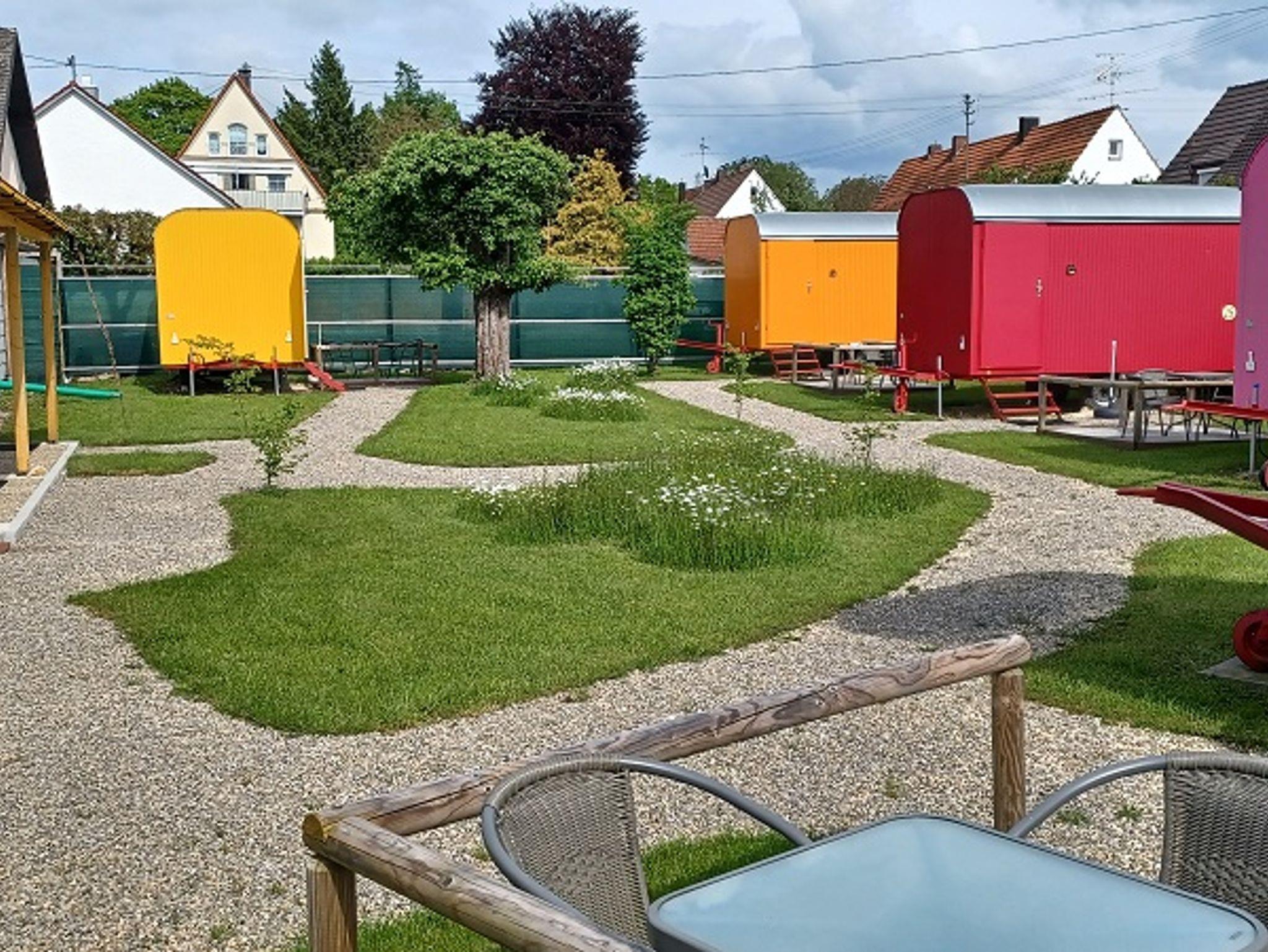 Der große Bauwagen hat eine Fläche von ca. 10,5m² mit einer Sitzecke (Bänke mit Stauraum) und einer eigenen Terrasse im Garten.