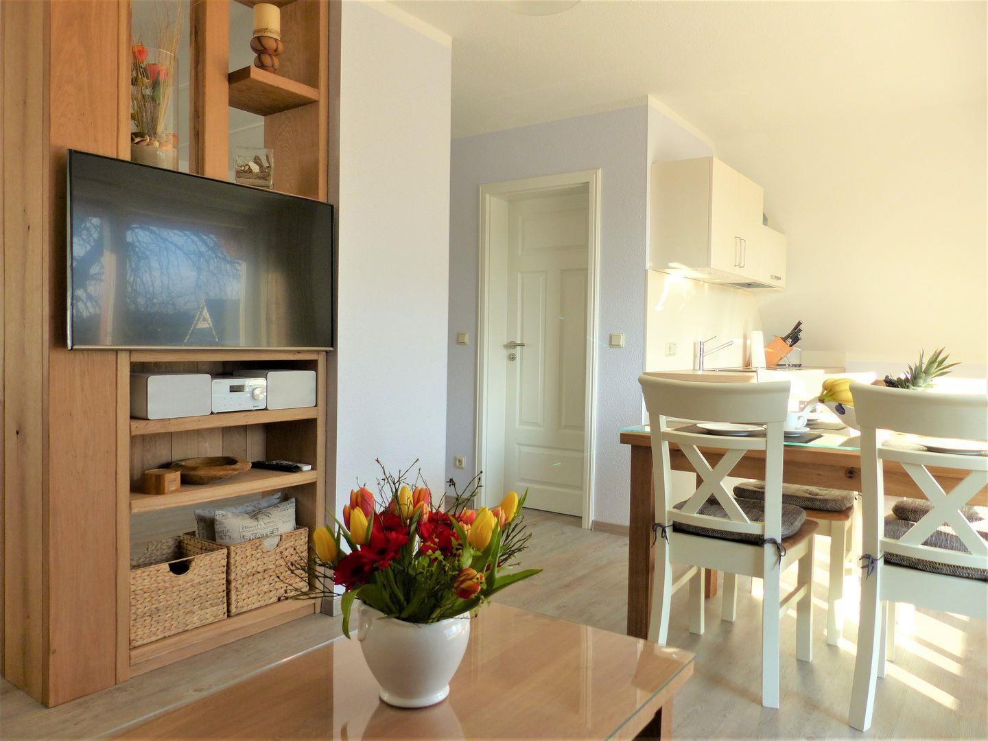 Ein gemütliches Appartement im Dachgeschoss, perfekt für maximal 4 Personen und einer großen Dachterrasse nach Süden ausgerichtet. Das Wohnzimmer ist mit einer praktischen Küchenzeile ausgestattet, damit Sie sich selbst versorgen können. Die Wohnung verfügt über 2 Schlafzimmer mit jeweils einem komfortables Doppelbett für erholsamen Schlaf. Im Bad finden Sie eine Dusche und WC. Haustiere und das Rauchen sind in der Wohnung nicht gestattet, jedoch gibt es WLAN für einen bequemen Internetzugang während des Aufenthalts. Der PKW-Stellplatz sowie ein abschließbarer Fahrradschuppen stehen Ihnen direkt am Grundstück zur Verfügung.
