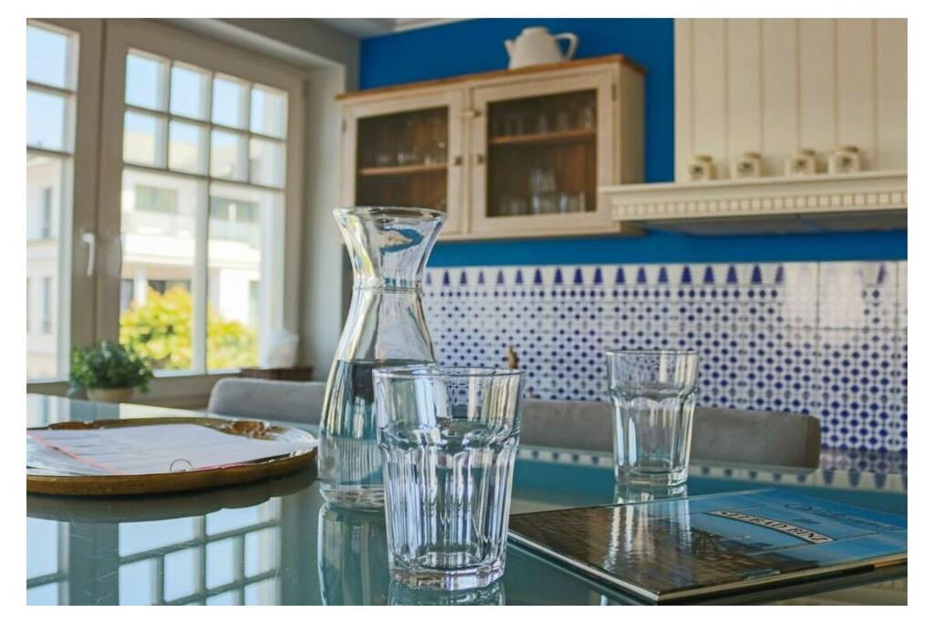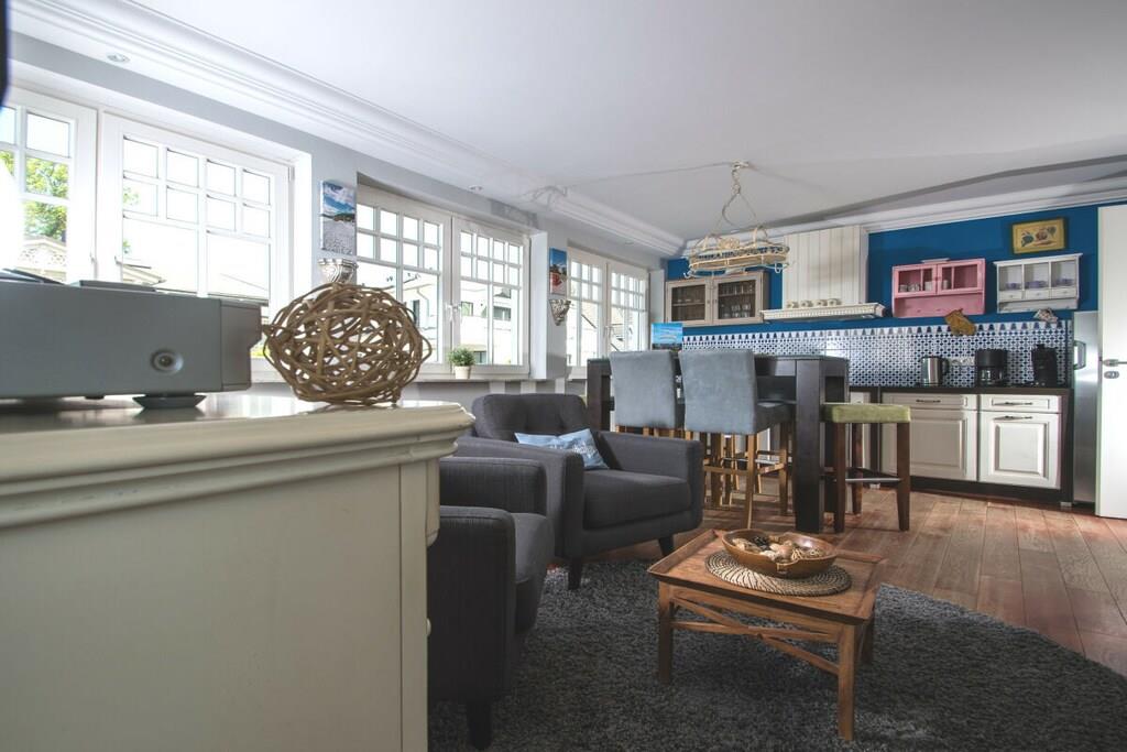 Das Feriendomizil besticht durch seine liebevolle Dekoration, die eine gelungene Mischung aus englischer Eleganz und maritimer Behaglichkeit wieder spiegelt. Der Wohn-Essbereich beeindruckt durch seine durchgehende Fensterfront mit Blick auf die kleinen Alleestraße. Der Küchenbereich ist zum Wohnbereich hin offen und ermöglicht ein kommunikatives Wohngefühl. Ein eleganter Essbereich mit Hochtisch und 6 Hochstühlen ist in dieses offene Wohnkonzept integriert. Die Küche ist komplett eingerichtet und verfügt über alle modernen Geräte, wie E-Herd, Backofen, Geschirrspülmaschine, Kühlschrank, Kaffeemaschine, etc… Von einem Schlafzimmer aus haben Sie direkten Zugang zum Badezimmer mit Badewanne und es gibt ein weiteres kleines Duschbad.