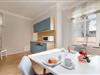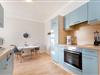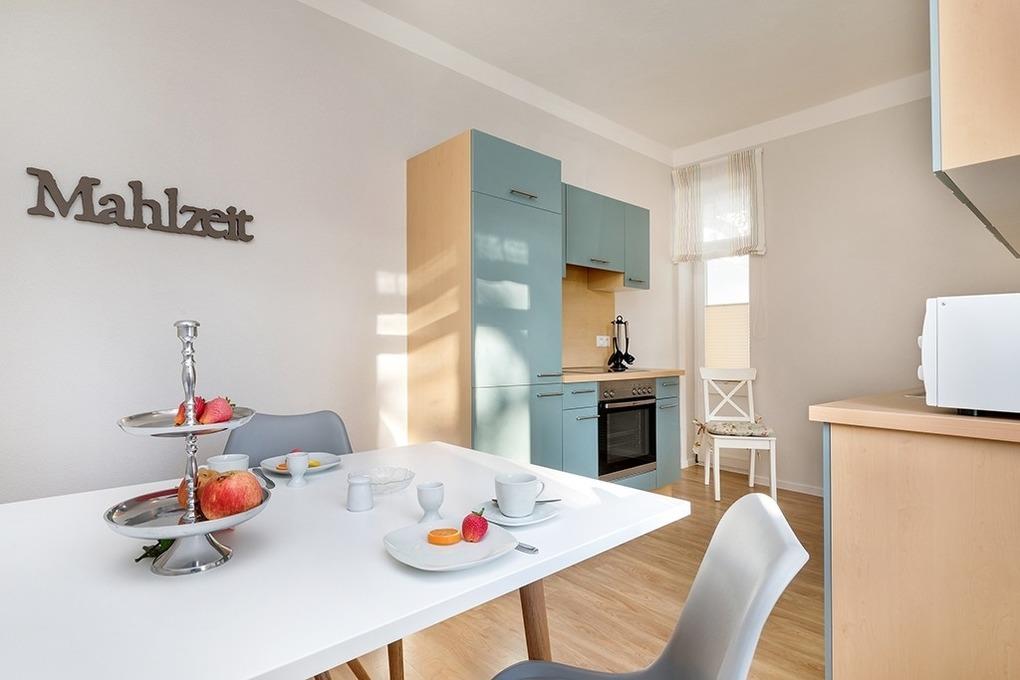 Separate Küche, voll ausgestattet, u. a. mit Spülmaschine, Kühlschrank mit Gefrierfach, Cerankochfeld und Backofen, Mikrowelle, Kaffeemaschine, Wasserkocher und Toaster. Der Essplatz befindet sich in der Küche, Esstisch mit 4 Stühlen.