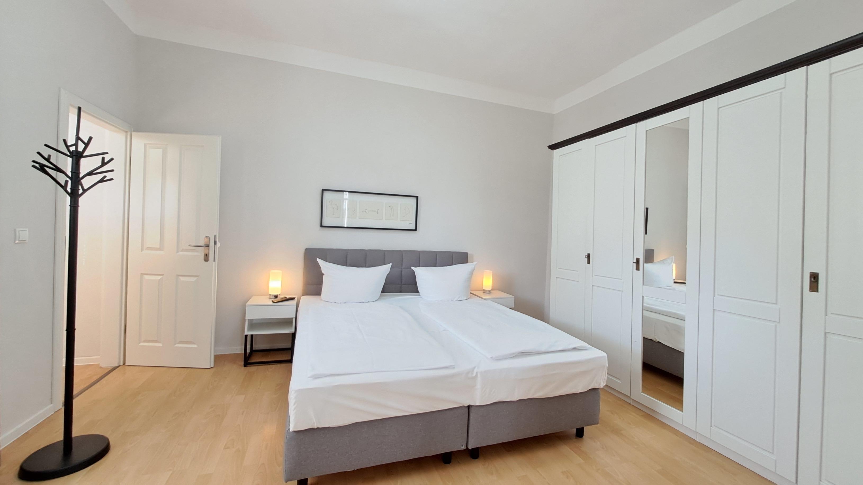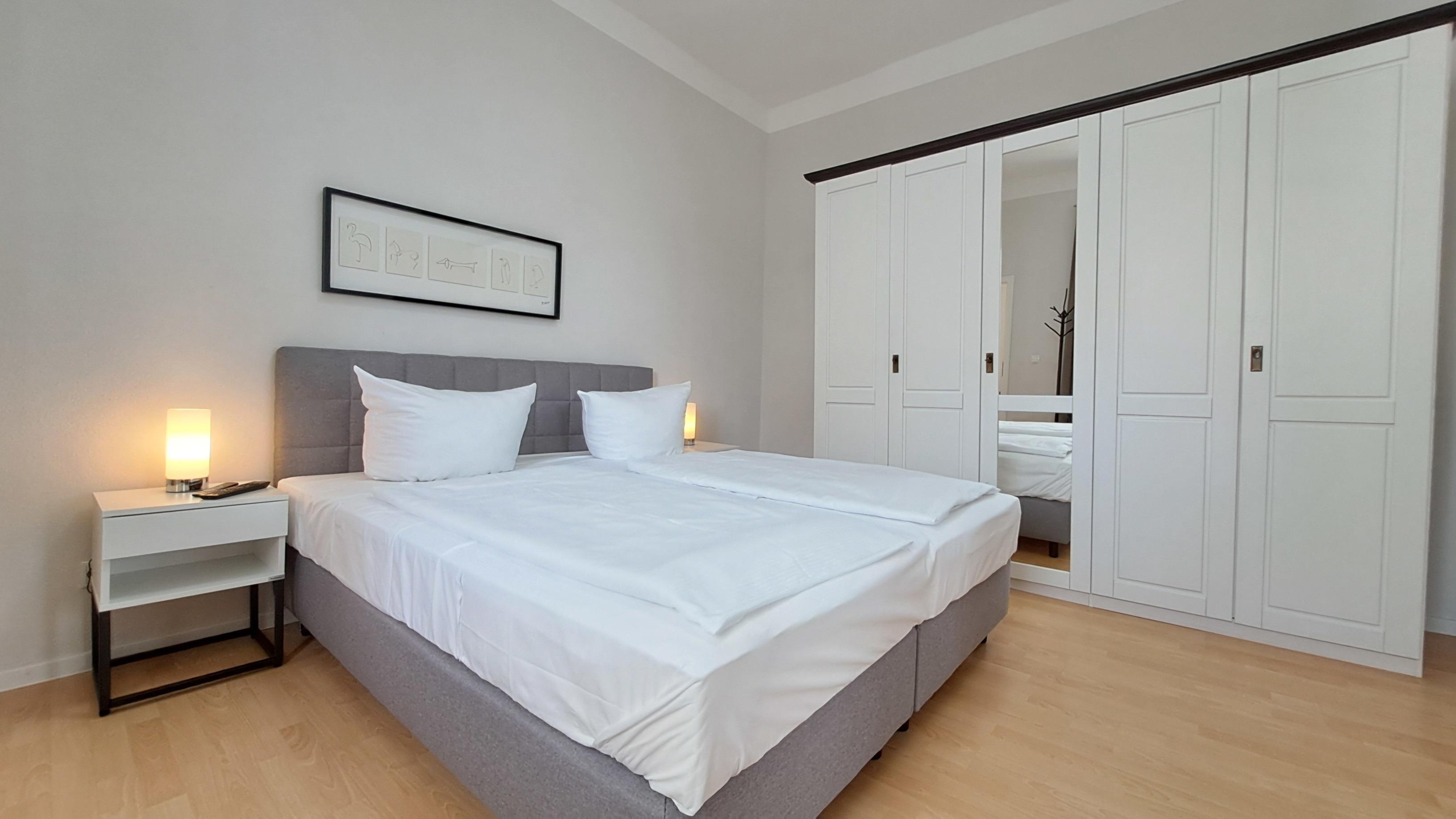 1 Schlafzimmer mit Boxspringbett (180x200cm), 2 Nachtschränkchen, großem Kleiderschrank und Stuhl (Durchgangszimmer zum Wohnzimmer