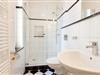 Badezimmer mit Fenster, Glasdusche, Waschtisch, Spiegel, WC, Handtuchheizkörper und Föhn