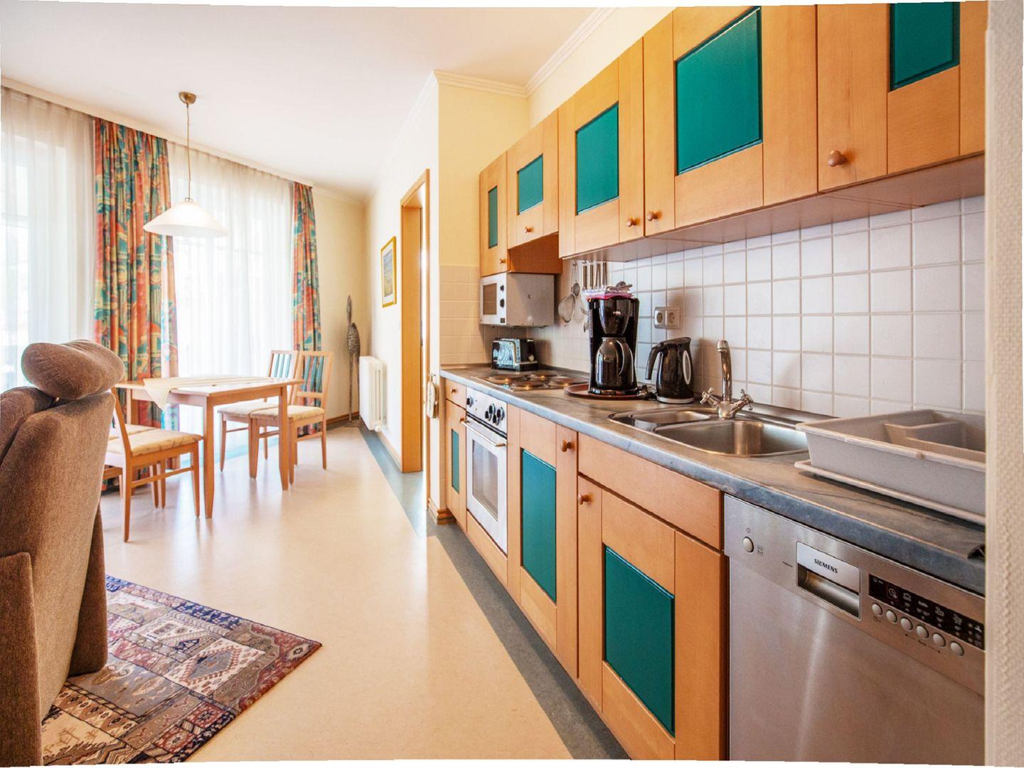 Der Wohnraum dieser hübschen Ferienwohnung mit privatem Balkon verbindet eine Wohnküche mit einem Essbereich und besitzt ein separates Schlafzimmer. Die voll ausgestattete Küchenzeile überzeugt mit einem Geschirrspüler, einer Koch- und Backmöglichkeit, einer Mikrowelle, einem Wasserkocher und einer Kaffeemaschine. Das Wohnzimmer bietet neben einem 26 Zoll LCD-Flachbildfernseher, einem DVD-Player und einer Stereo-Anlage auch eine ausziehbare Schlafcouch als zweite Schlafmöglichkeit. Im Schlafzimmer steht ein Doppelbett. Das Badezimmer verfügt neben einer geräumigen Dusche auch über ein Waschbecken, ein WC und einen großen Ganzkörperspiegel. Haustiere sind in dieser Wohnung herzlich willkommen.