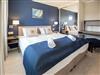 Dünenresidenz Neues Prora, Wohnzimmer mit LCD-TV, Balkon mit Meerblick, eingerichtete Küchenzeile mit Geschirrspüler und Backofen, Schlafzimmer mit Doppelbett und Fernseher, Bad mit Dusche, kostenfreier WLAN-Anschluss, Haustiere erlaubt, Nichtraucher
