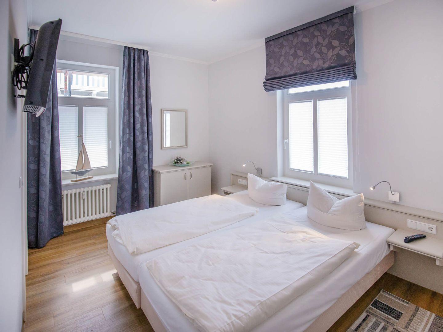 Die Besonderheit dieser hellen Ferienwohnung ist ein separates seeseitiges Erkerzimmer. Der Wohnraum verbindet das Wohnzimmer mit einem Essbereich und einer gut ausgestatteten Küche. Vorhanden sind hier ein 4-Platten-Ceranherd, ein Geschirrspüler, eine Mikrowelle mit Grillfunktion, eine Kaffeemaschine, ein Wasserkocher und ein Toaster. Das Wohnzimmer punktet neben einem Schlafsofa auch mit einem Kabel-TV (LCD), einem DVD-Player und einer Stereo-Anlage. Im Schlafzimmer steht ein Doppelbett, ein angrenzendes Ankleidezimmer bietet ausreichend Stauraum. Das Badezimmer überzeugt mit einer geräumigen Dusche, einem Waschbecken, einem WC und einem großen Spiegel. Haustiere sind in dieser Wohnung herzlich willkommen. In der Zeit von Mai bis September ist ein eigener Strandkorb am Strand gegen Aufpreis buchbar.