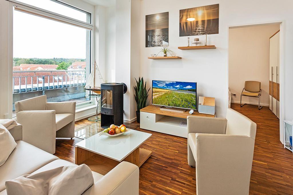 Das stilvolle 94 qm große 3-Zimmer-Penthaus lädt bis zu 4 Personen dazu ein, einen erholsamen Ostseeurlaub in exklusivem, leichtem und modernem Wohnambiente zu verbringen. Besonders hervorzuheben sind die tolle, großzügige Dachterrasse, der Balkon, ein Kamin, die Fußbodenheizung und die Whirlbadewanne im Apartment.