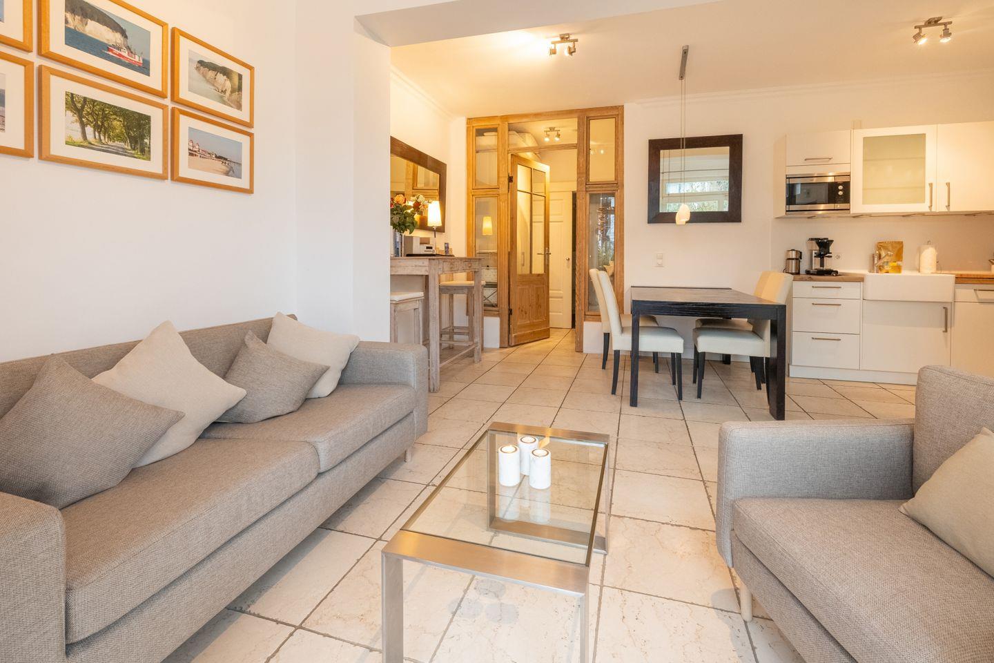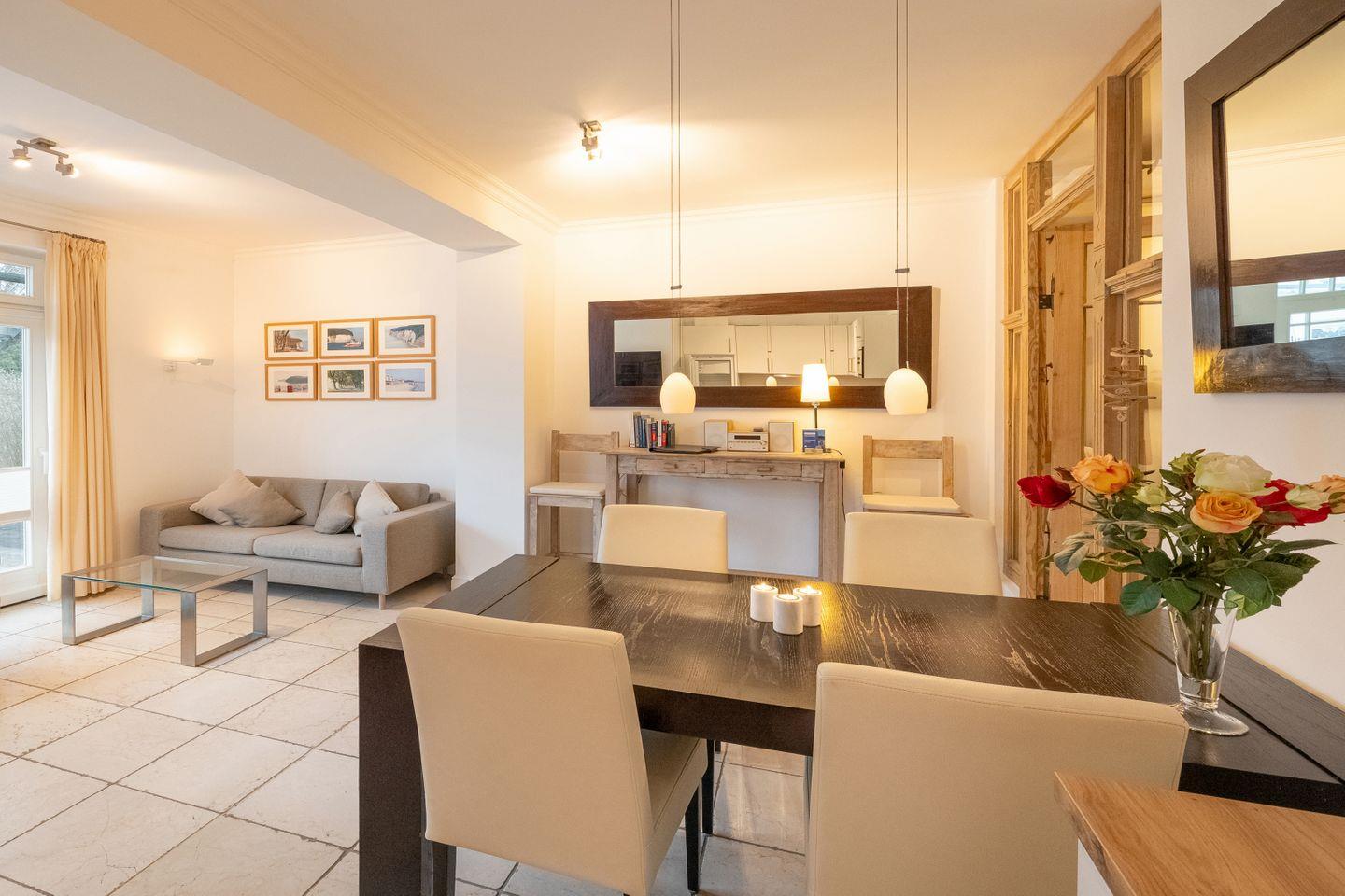Luxus in ruhiger Toplage: Diese helle Ferienwohnung begeistert mit zwei Terrassen – eine mit Blick auf den Kurpark, die andere geschützt hinter einer Hecke. Nur wenige Schritte trennen Sie vom Strand und Ihrem eigenen Strandkorb in der ersten Reihe.