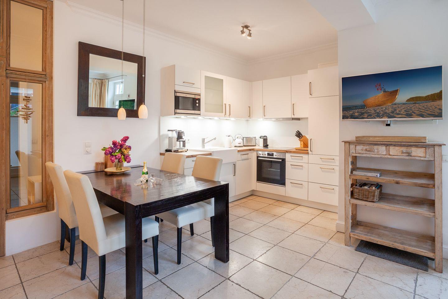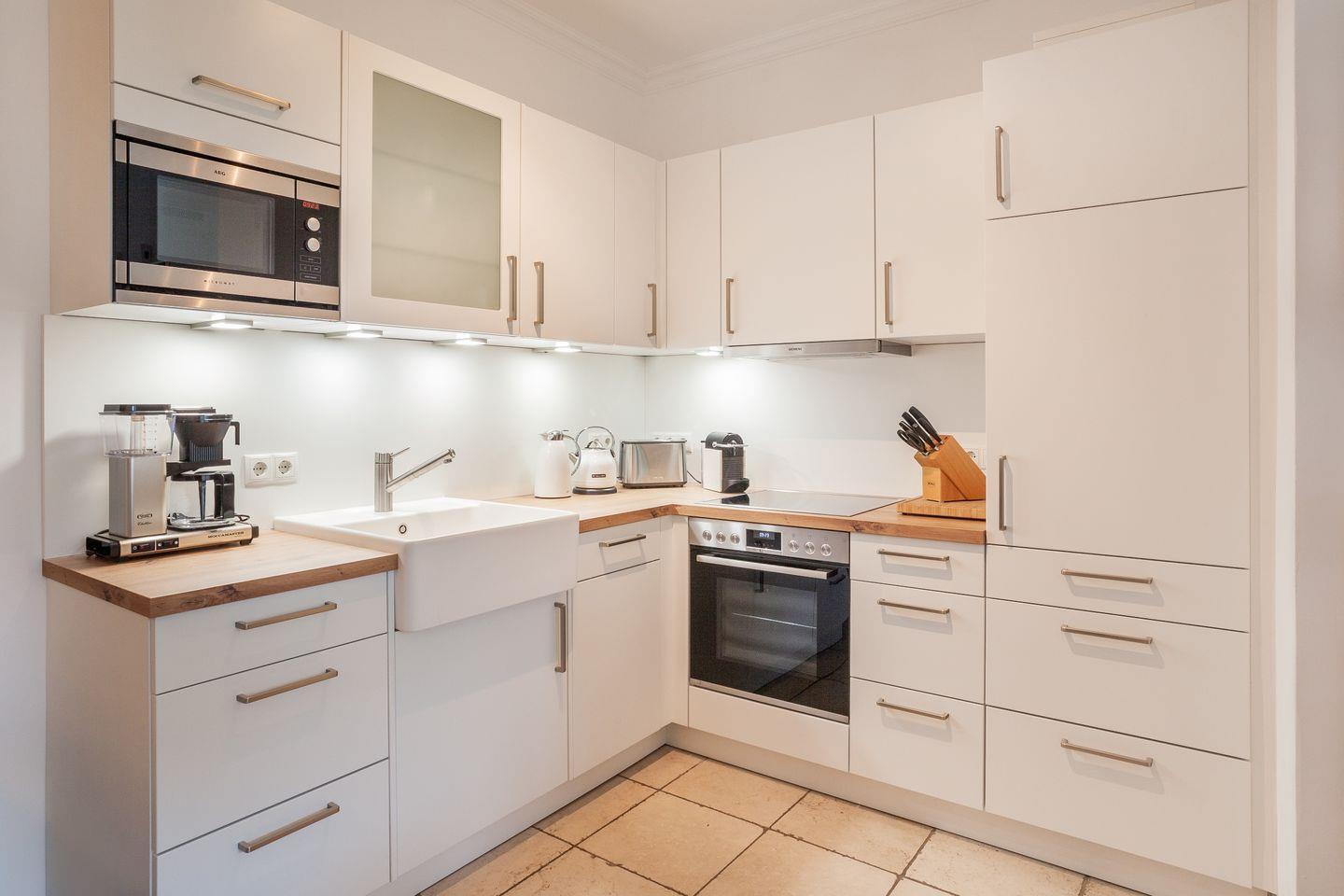 * Küche: Moderne Küchenzeile mit Spülmaschine, E-Herd mit Backofen, Kaffeemaschine, Mikrowelle, Nespressomaschine, Wasserkocher, Toaster