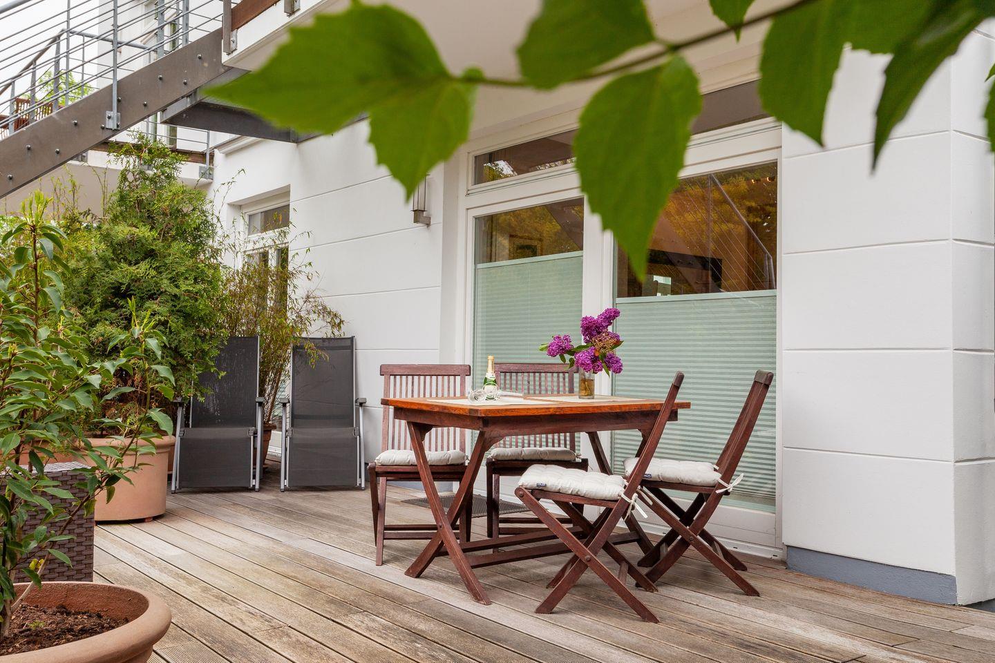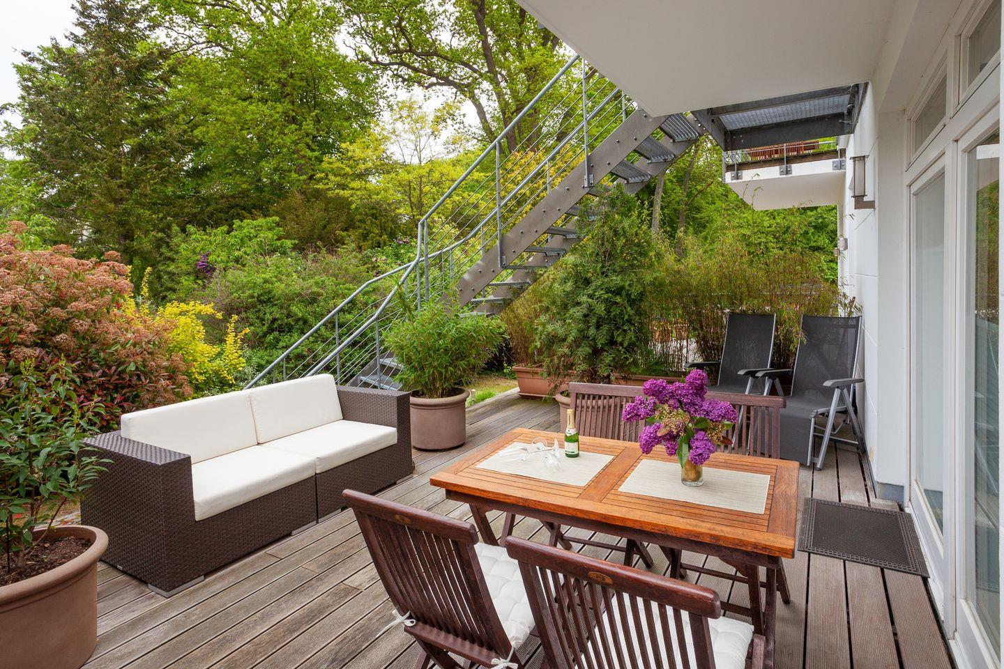 * große Terrasse (Nordausrichtung, 18 m²) mit Blick in den Kurpark