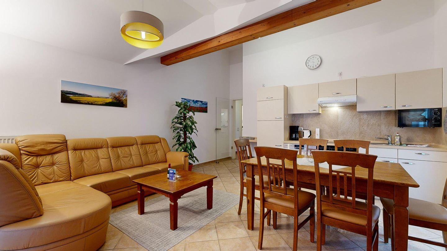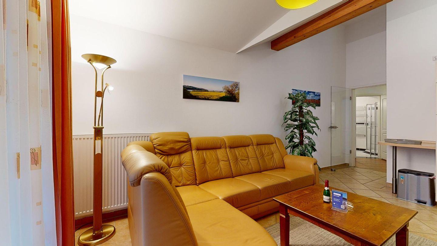 * Wohnzimmer: Couchgarnitur (Schlafcouch für 1-2 Pers.), Kabel-TV, Radio mit CD-Player, WLAN-Internetanschluss und Essplatz