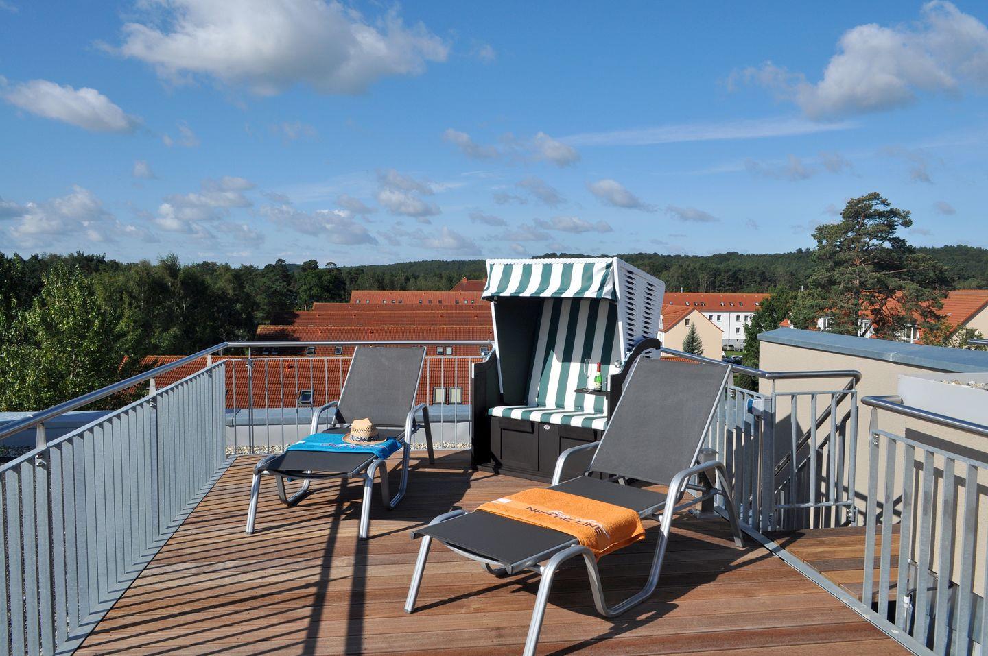 Moderne Ferienwohnung mit Dachterrasse, Strandkorb, Fahrstuhl und Tiefgarage nahe dem Strand in Binz.